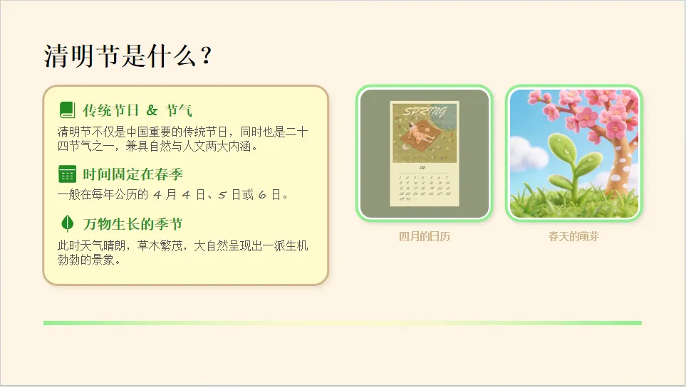 - 观看 PPT 第 3 页:教师引导幼儿了解清明节的时间(4 月 4 日或 5 日)和节气特点(万物复苏)。