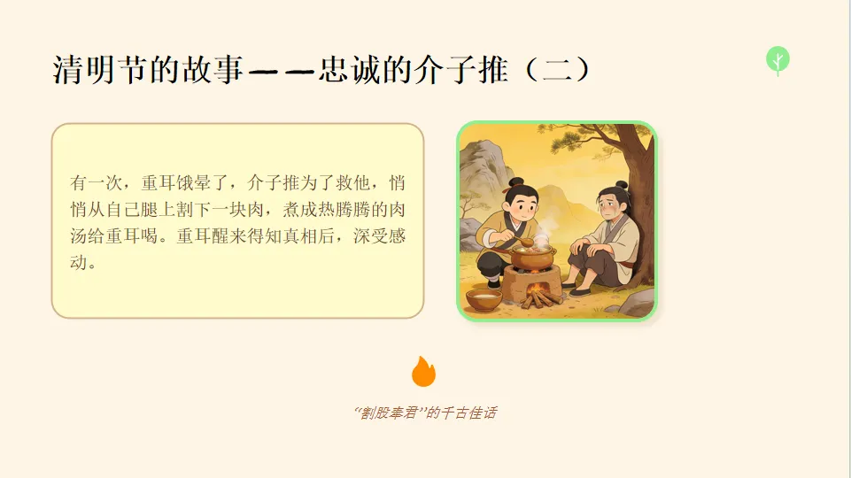 - 讲述介子推的故事:教师结合 PPT 第 4-6 页,用生动、简洁的语言讲述介子推的故事,重点突出介子推的忠诚和重耳的感恩与懊悔。