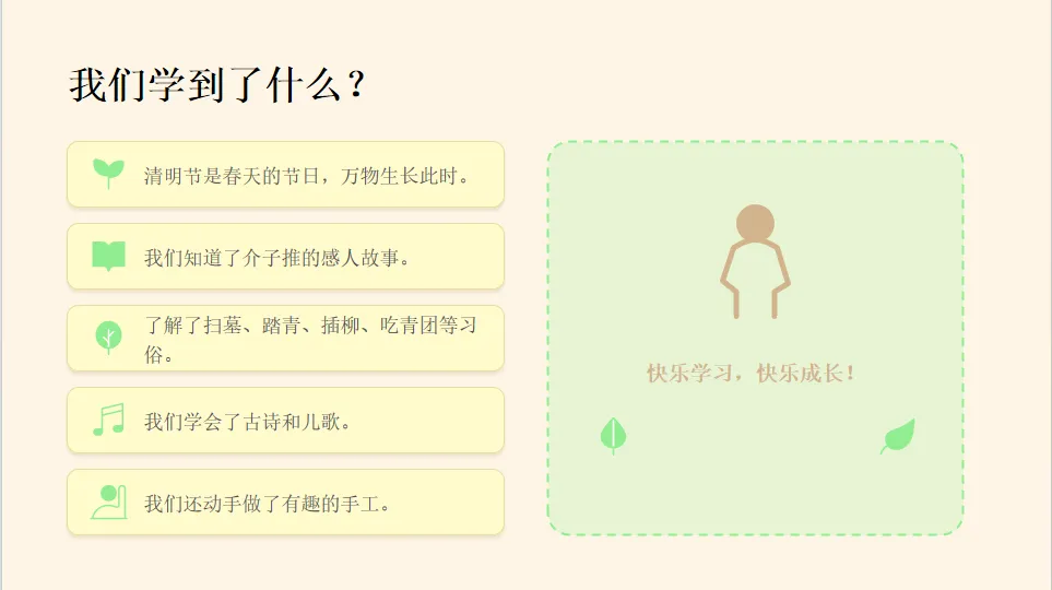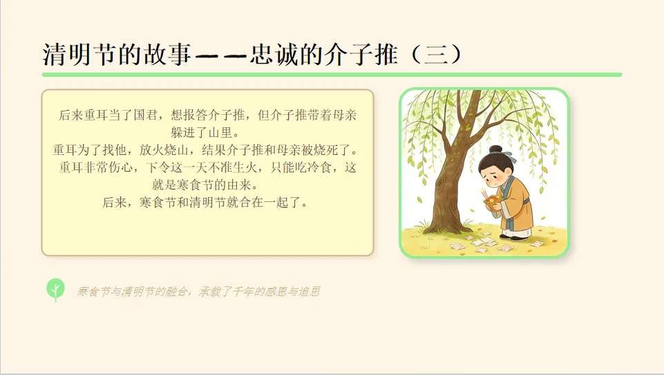 - 认知目标:初步了解清明节是春天的传统节日,知道清明节的时间、主要习俗(扫墓、踏青、插柳、吃青团),并能说出介子推的故事梗概。