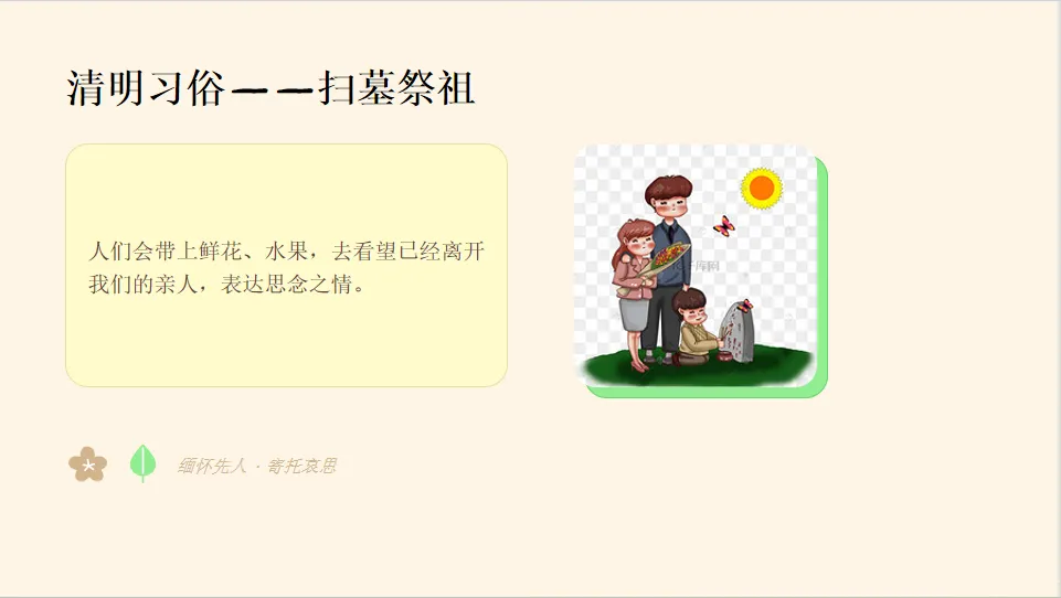 - 引出主题:教师出示 PPT 封面,引导幼儿观察画面:“春天里有一个很特别的节日,它不仅是春天的节日,还和感恩、思念有关,你们知道是什么节日吗?” 引出清明节主题。