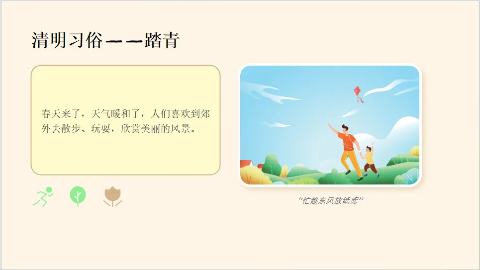 - 家庭活动:布置 PPT 第 18 页的课后小任务,请家长配合,带幼儿去踏青、尝试制作青团、为长辈捶背等,将节日教育延伸到家庭。