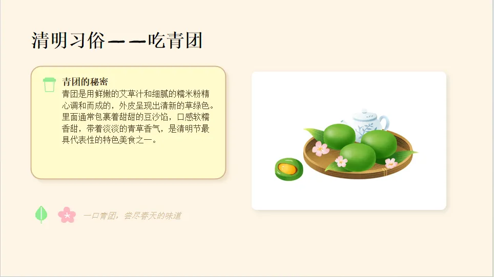 - 吃青团:展示青团实物或图片,引导幼儿观察其颜色和形状,说说它的味道。