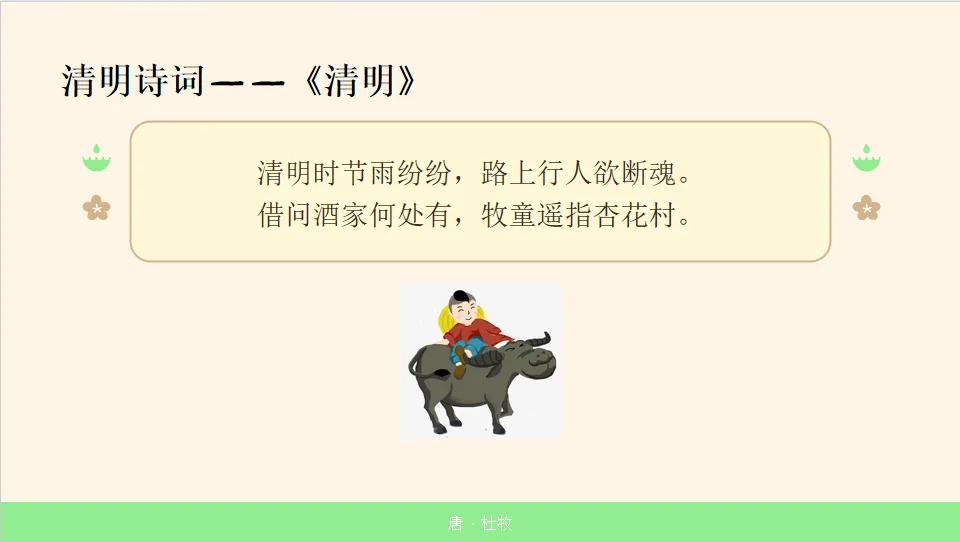 - 学习古诗《清明》:教师带领幼儿朗读 PPT 第 11 页的古诗《清明》,简单解释诗句的意思,感受诗歌的意境。