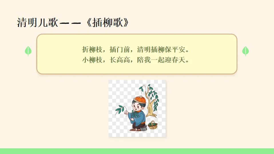 - 学唱儿歌:教师播放或带领幼儿学唱 PPT 第 12-13 页的儿歌《清明好》和《插柳歌》,鼓励幼儿边唱边做动作。