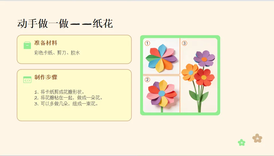 - 纸花:幼儿自主选择彩色卡纸,剪出花瓣形状,粘贴成花朵。