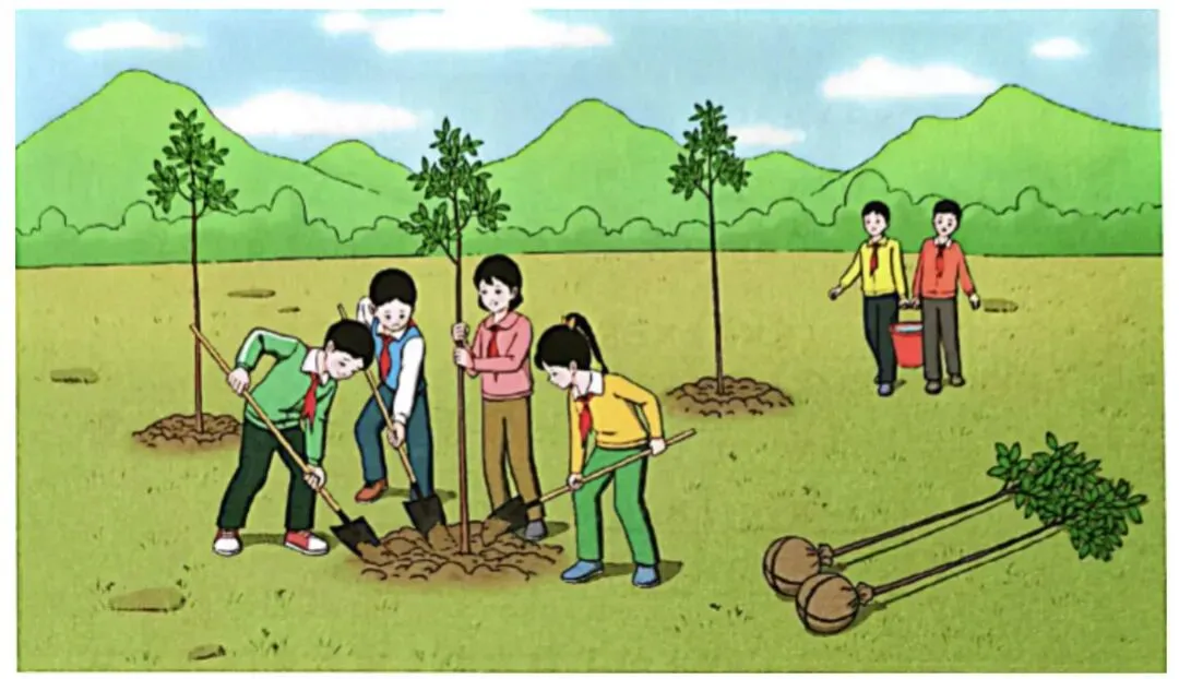 1. 出示主题图,提问:负责挖坑、种树的同学比负责抬水、浇树的多多少人?