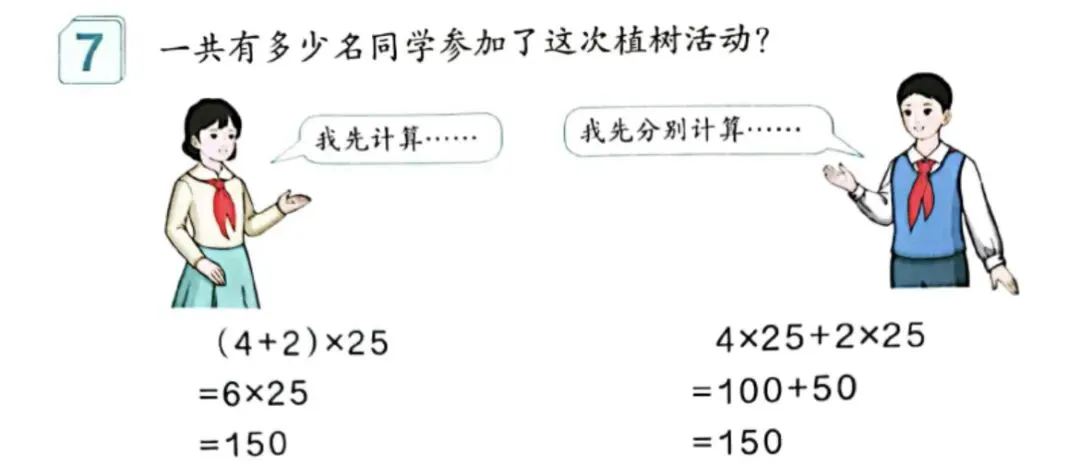预设 2: 4×25+2×25=100+50=150(人),4×25表示25个小组负责挖坑、种树的人数,2×25表示25个小组负责抬水、浇树的人数,再把它们加起来就是参加植树活动的总人数了。