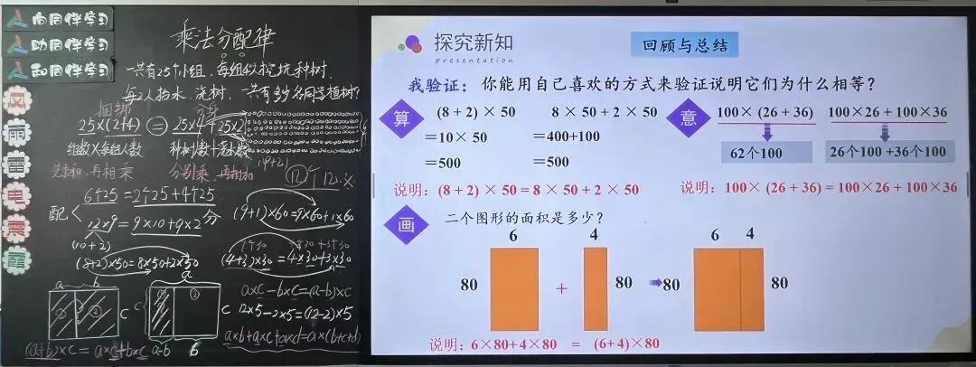 3. 揭示课题:这种“和乘一个数,等于分别相乘再相加”的规律,就是乘法分配律,今天我们就深入研究它。①从学生熟悉的长方形周长、两位数乘一位数口算切入,衔接旧知,让学生感受到新知的“熟悉感”。②数形互证,突破理解难点:通过图形分割的“形”,直观解释算式拆分的“数”,解决学生“为什么可以这样拆分”的困惑,突破“漏乘”“不理解算理”的易错点,让抽象的运算律变得具象可感。③思维递进,落实核心素养:从图形面积到算式口算,从具体案例到共性提炼,逐步引导学生经历“观察—对比—归纳”的过程,培养观察分析、归纳概括能力,渗透模型意识,契合乘法分配律的教学核心。以数形结合为核心,依托板书现有素材,遵循“形→数→规律”的认知逻辑,贴合四年级学生从具象到抽象的思维特点,避免直接灌输公式,让学生在“看图形、列算式、找规律”中自然感知乘法分配律的本质,同时衔接旧知,降低新知学习难度。二、探究乘法分配律