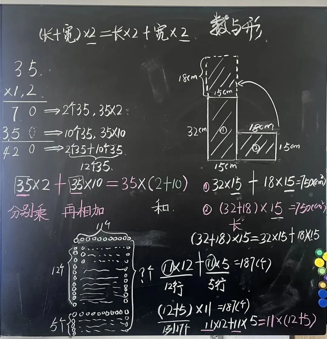 1. 回顾口算经验:指向黑板左侧的35×12拆分过程(35×2 + 35×10 = 35×(2+10)),提问:我们之前口算35×12时,把12拆成2+10,分别相乘再相加,和刚才求图形面积的思路有什么共同点?
