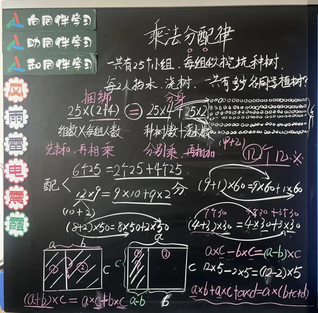 生3:我还发现了可以先算4+2的和,再乘25;也可以先算4×25、2×25,再把积相加,结果不变。即(4+2)×25=4×25+2×25。