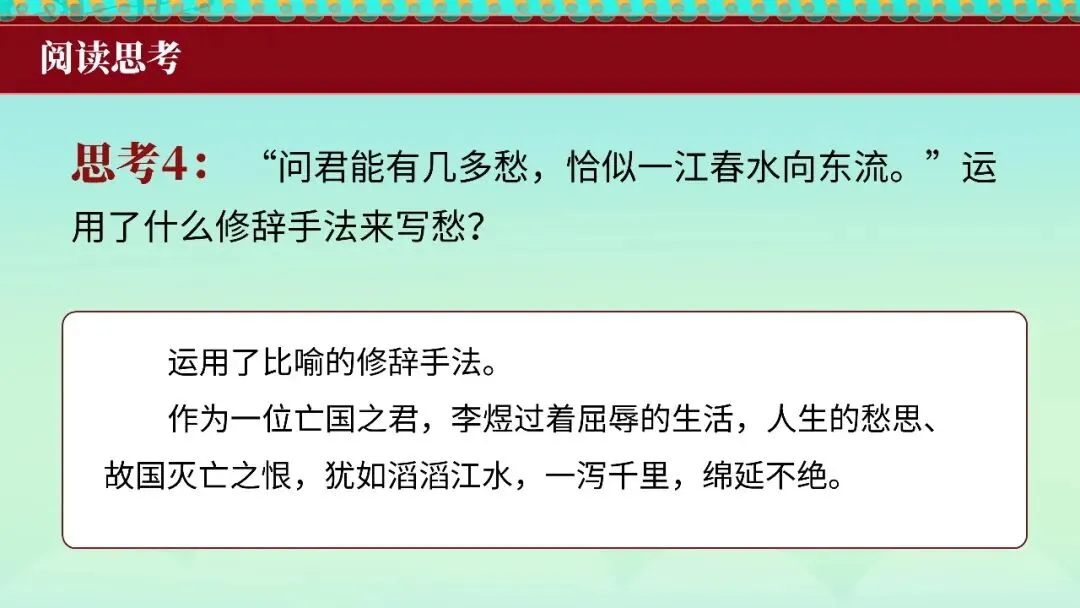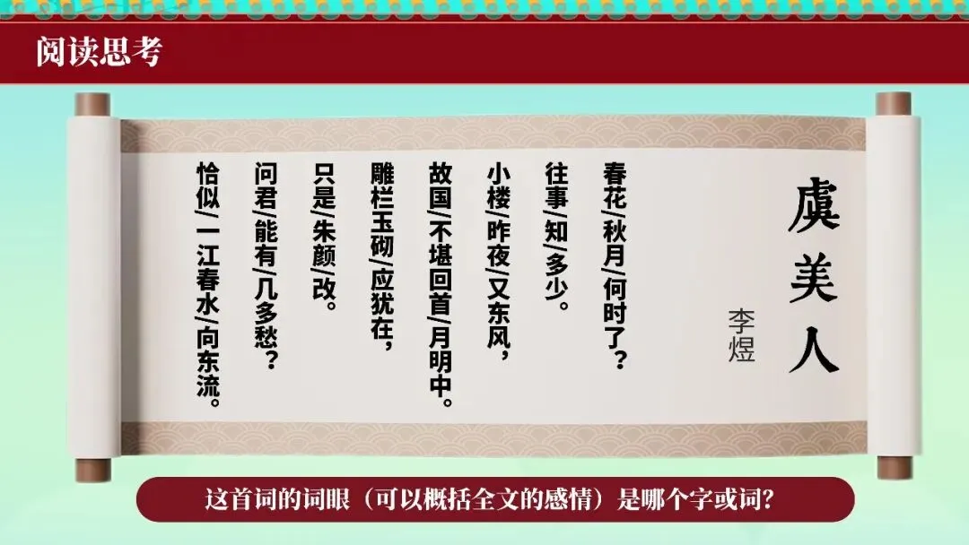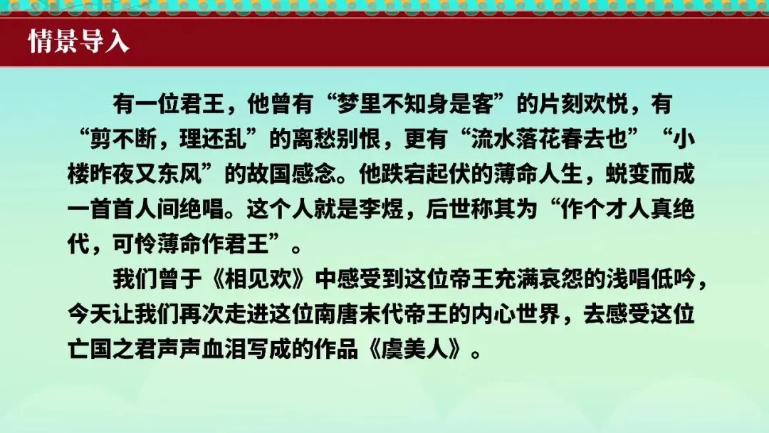 本期更新的课件为统编高教社版中职语文基础模块下册古诗词单元《虞美人》,共20页。