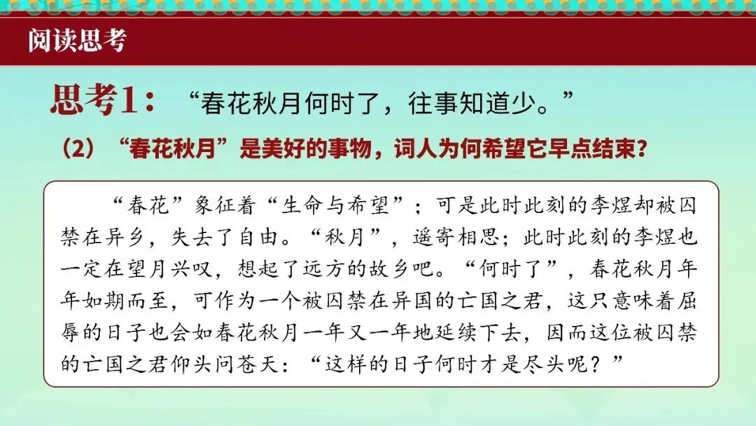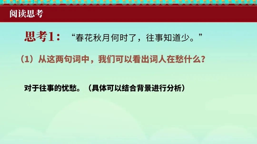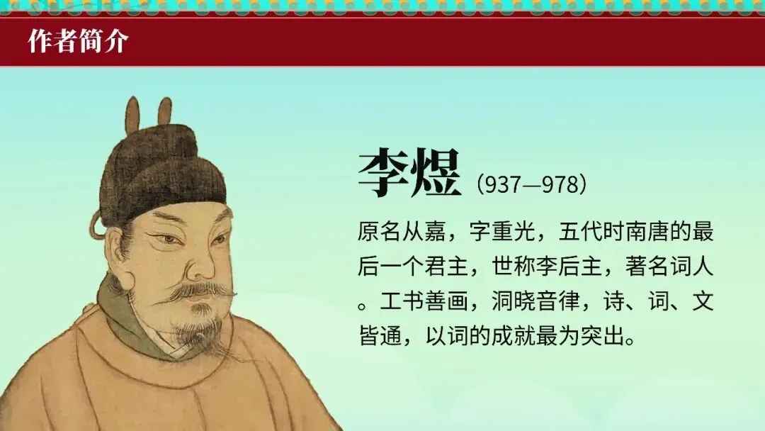 本文是南唐后主李煜的词作绝命词。全词以"春花秋月何时了"起笔,抒发亡国之痛与人生无常的悲慨,"小楼昨夜又东风"暗写囚徒生涯,"雕栏玉砌应犹在,只是朱颜改"寄寓物是人非之痛,结句"问君能有几多愁?恰似一江春水向东流"以水喻愁,千古传诵。词作突破晚唐五代绮靡词风,直抒胸臆,血泪交迸,是词史上由伶工之词转为士大夫之词的关键之作。