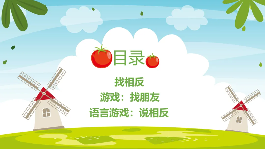 1.在游戏中理解反义词的含义,丰富词汇,体验游戏的快乐。