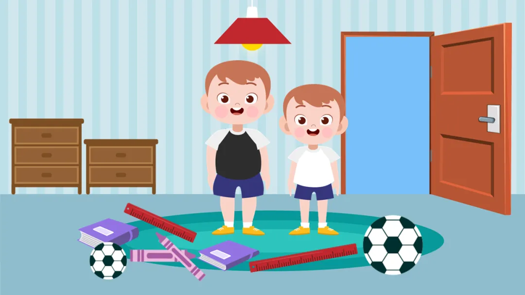 提问:仔细观察双胞胎在家时和外出时的房间,你们能找到藏着的反义词么?