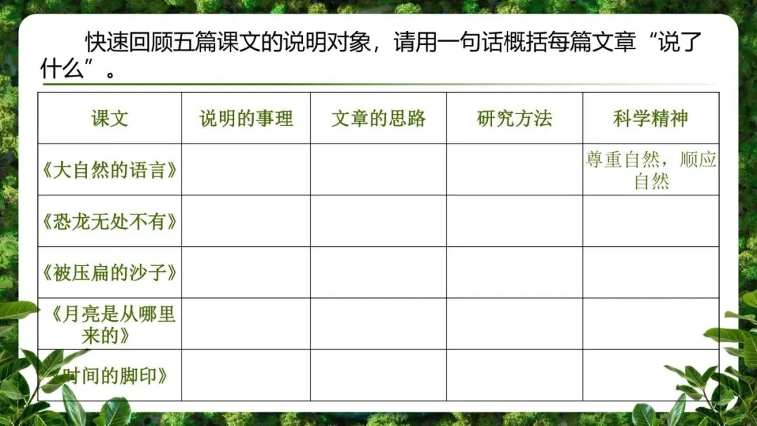 出示PPT,快速回顾五篇课文的说明对象,请学生用一句话概括每篇文章说了什么”。