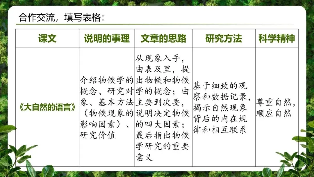 教师出示表格(见下),各小组分工合作,完成填写。建议:每组负责12篇课文,重点填写”研究方法”与”科学精神”两栏。
