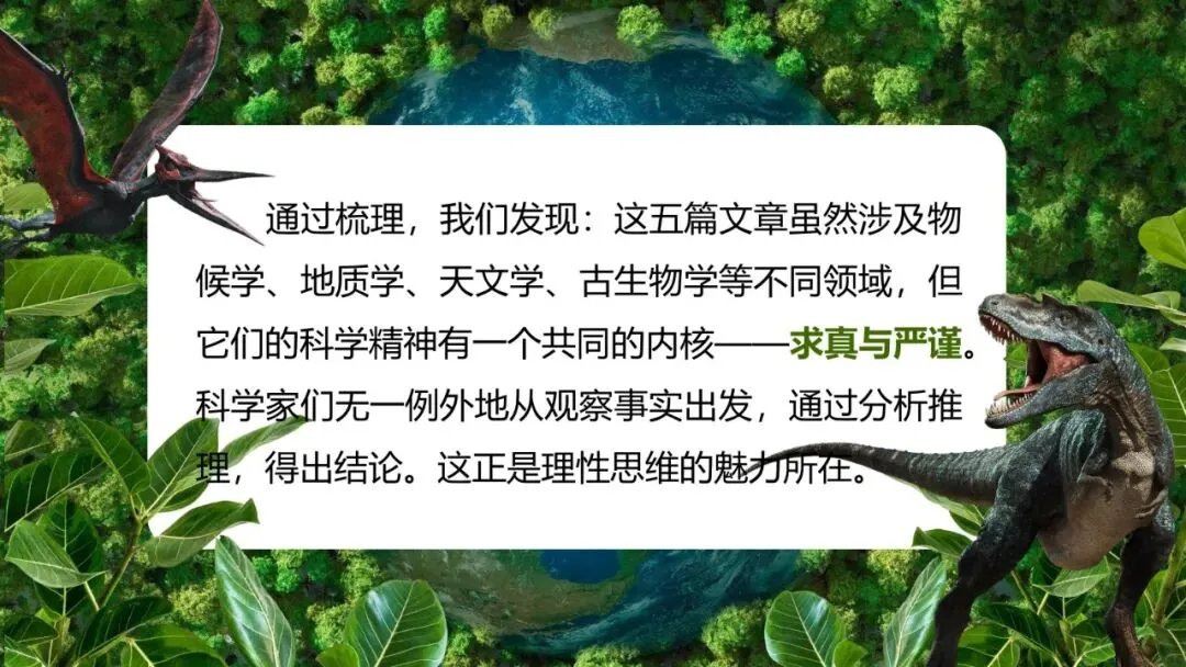 总结:通过梳理,我们发现:这五篇文章虽然涉及物候学、地质学、天文学、古生物学等不同领域,但它们的科学精神有一个共同的内核——求真与严谨。科学家们无一例外地从观察事实出发,通过分析推理,得出结论。这正是理性思维的魅力所在。