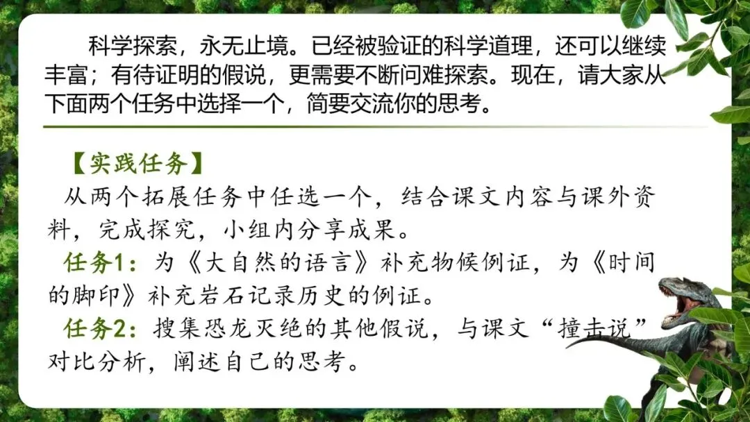 任务2:搜集恐龙灭绝的其他假说,与课文“撞击说”对比分析,阐述自己的思考。