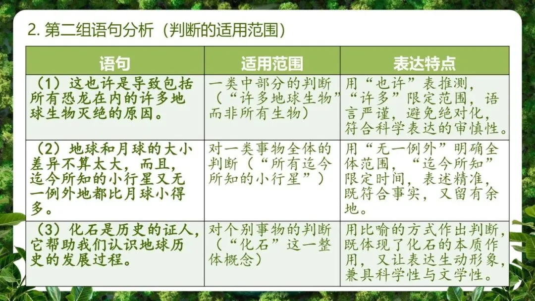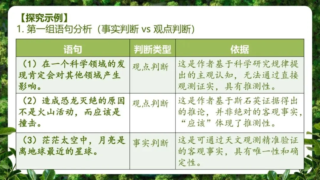 辨析判断的类型(事实/观点、适用范围),感受语言与逻辑的关系