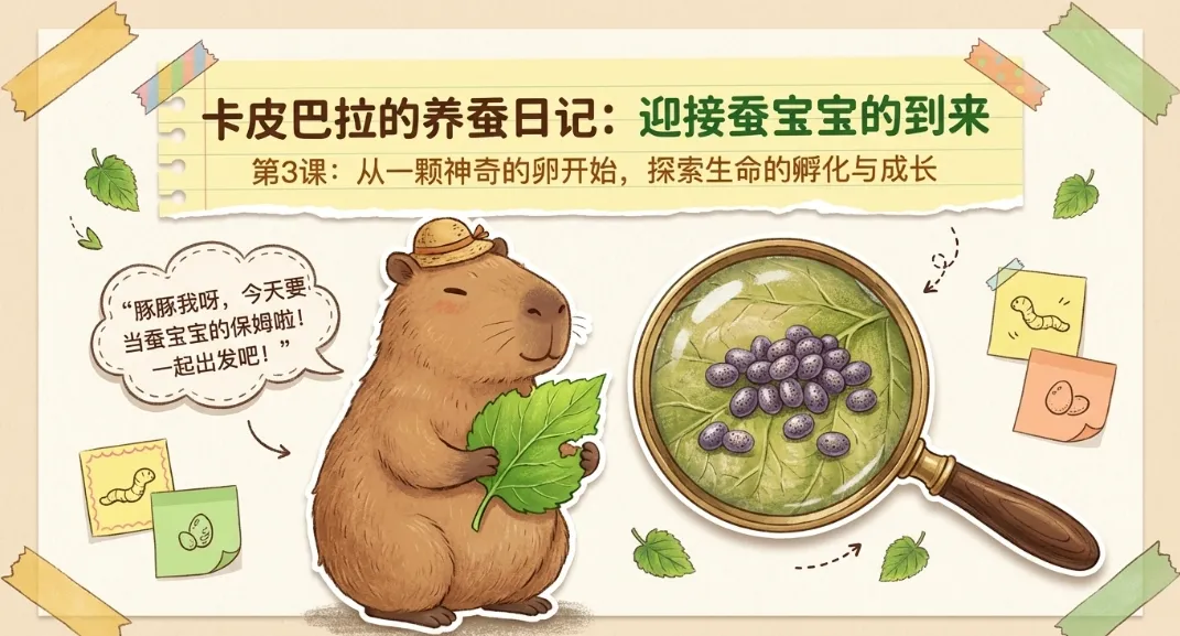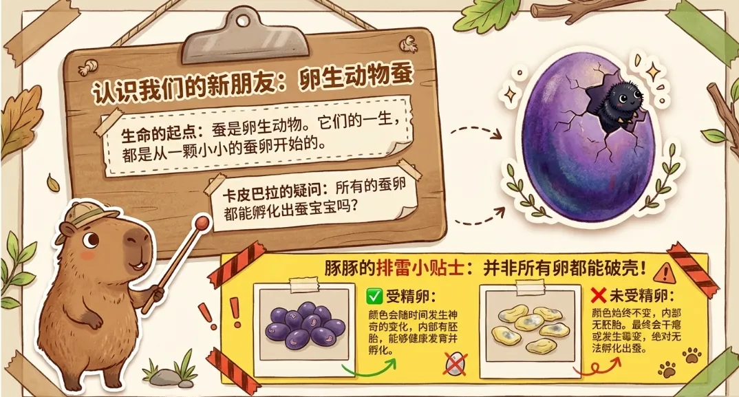 从学情适配来看,三年级学生好奇心强,喜欢小动物,但缺乏系统的科学观察方法,对生命的理解较为浅显。课件开篇摒弃枯燥的理论讲解,以贴近孩子的生活场景导入,搭配温和治愈的卡皮巴拉风格设计,用柔和的画面、生动的蚕卵图片,快速拉近学生与蚕的距离,消除陌生感。从 你见过蚕吗想不想养一只属于自己的蚕宝宝”等简单问题切入,唤醒学生的生活经验,让学生带着期待进入学习,符合低中段学生 “先感兴趣、再学知识” 的认知规律。