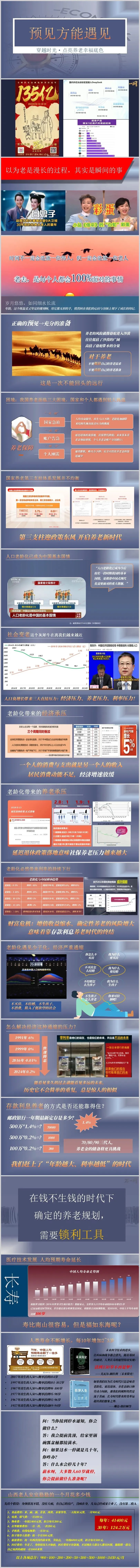 养老风险是看得见的现金流风险,决定老年生活质量的一定不是资产总量,而是现金流。我们需要有生命等长、不可挪用、没有波动、兼顾传承的养老资金。与时间做朋友,做好养老规划,就像穿越时光隧道,靠着源源不断的现金流,给未来的自己和家人多一份从容。让我们善待那个还未长大的子女和终将老去的自己,通过合理的养老规划和财富储备,穿越时光,点亮养老的幸福底色,实现财富安全的未来、家人健康的未来、晚年健康的未来。携手共进,让从容、幸福直达目光所及的最远处!