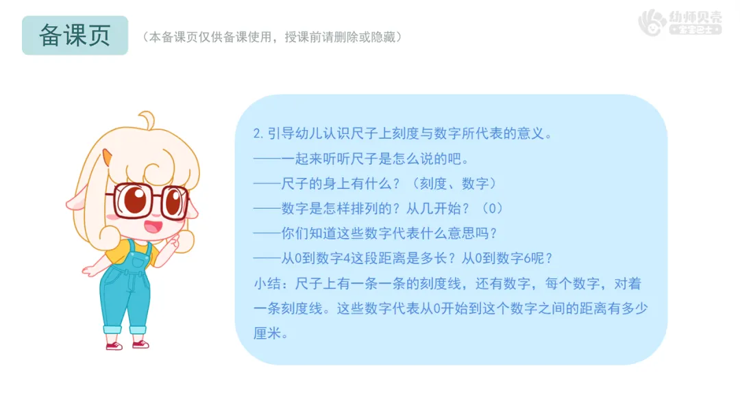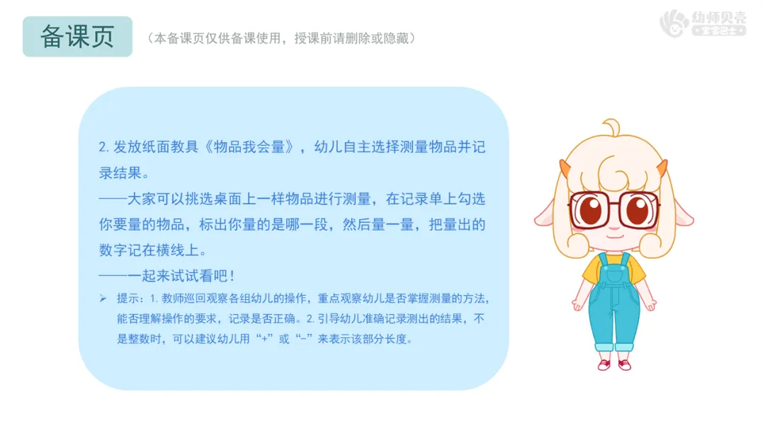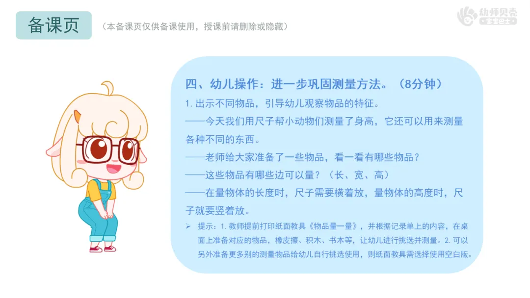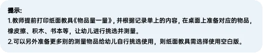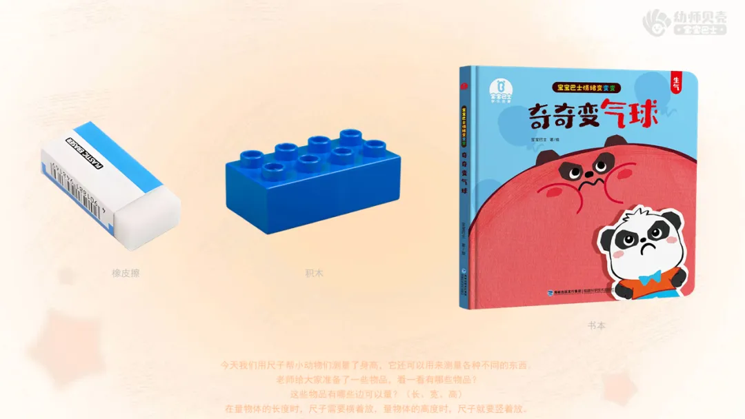 l材料准备:厘米尺(不出现毫米的刻度线)每人1把、橡皮擦(每组2个)、书本(每组2本)、积木(每组2个)。