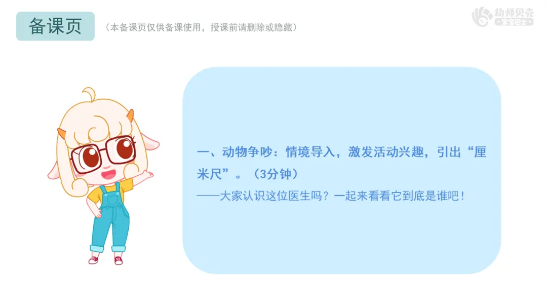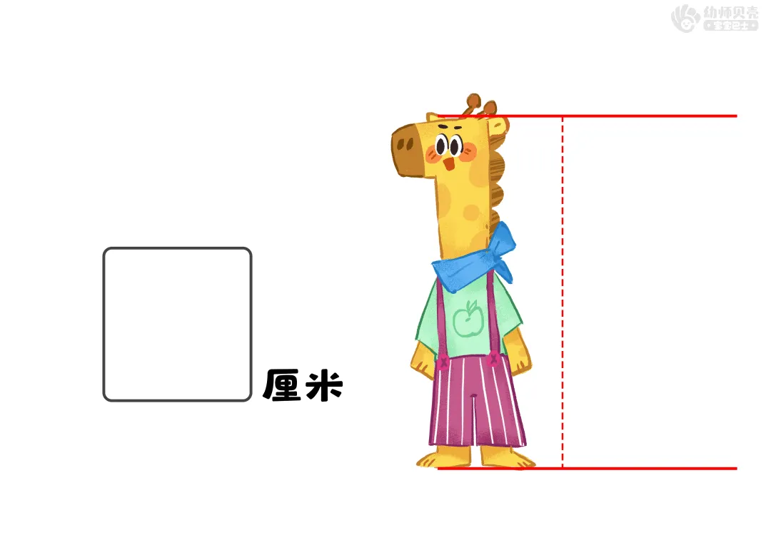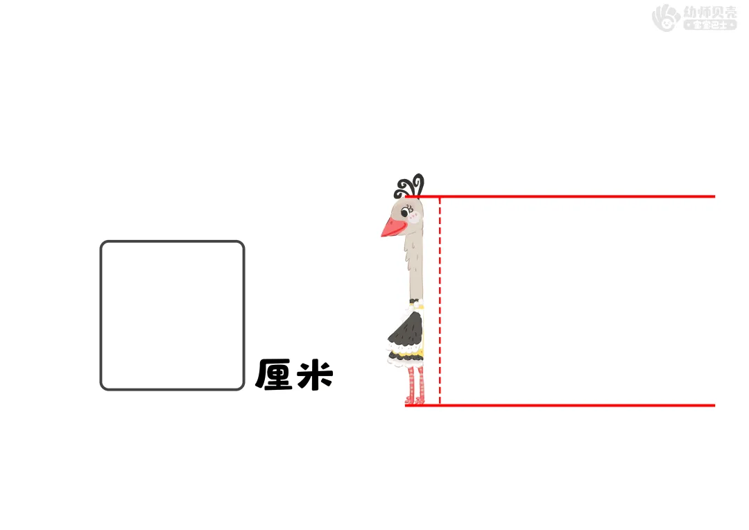 1.出示图片“不同动物量身高”,发现测量问题,初步感知用厘米尺测量的技巧。