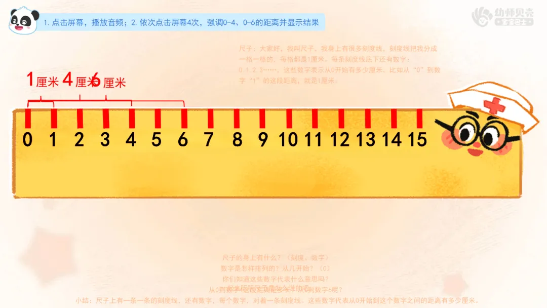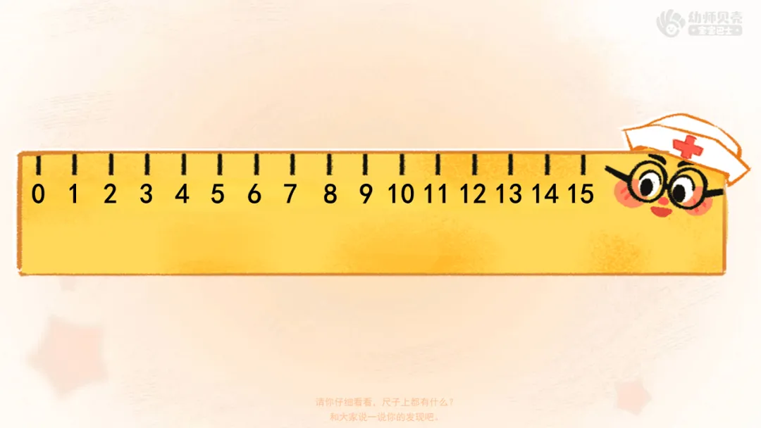 1.出示实物尺子,引导幼儿初步观察尺子,分享自己的发现。——请你仔细看看,尺子上都有什么? ——和大家说一说你的发现吧。 2.引导幼儿认识尺子上刻度与数字所代表的意义。——一起来听听尺子是怎么说的吧。 ——尺子的身上有什么?(刻度、数字) ——数字是怎样排列的?从几开始?(0) ——你们知道这些数字代表什么意思吗? ——从0到数字4这段距离是多长?从0到数字6呢? 小结:尺子上有一条一条的刻度线,还有数字,每个数字,对着一条刻度线。这些数字代表从0开始到这个数字之间的距离有多少厘米。