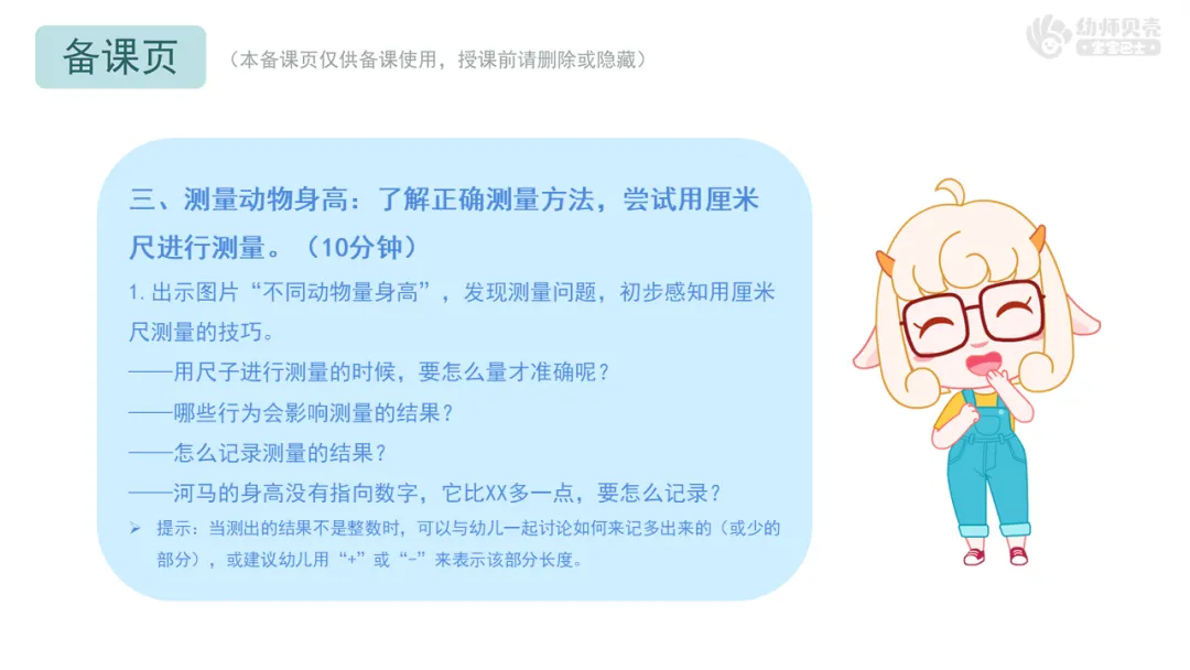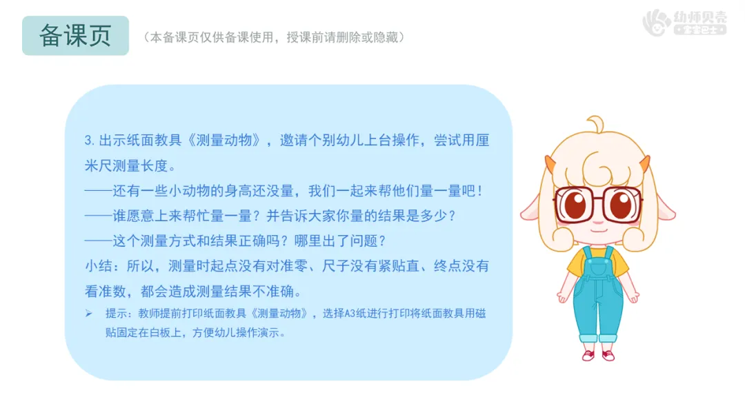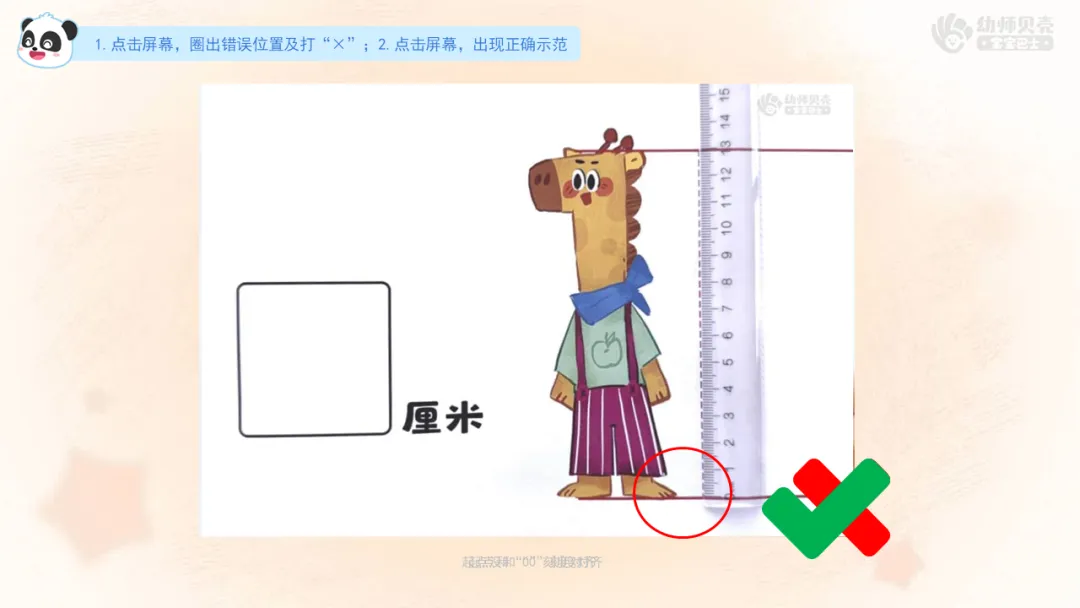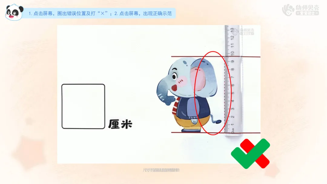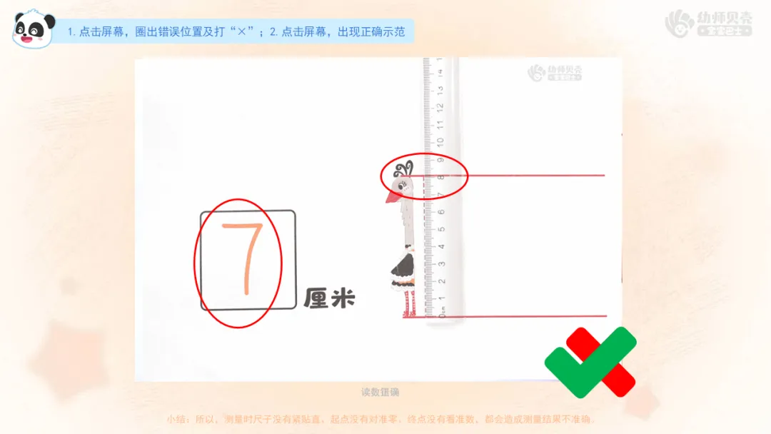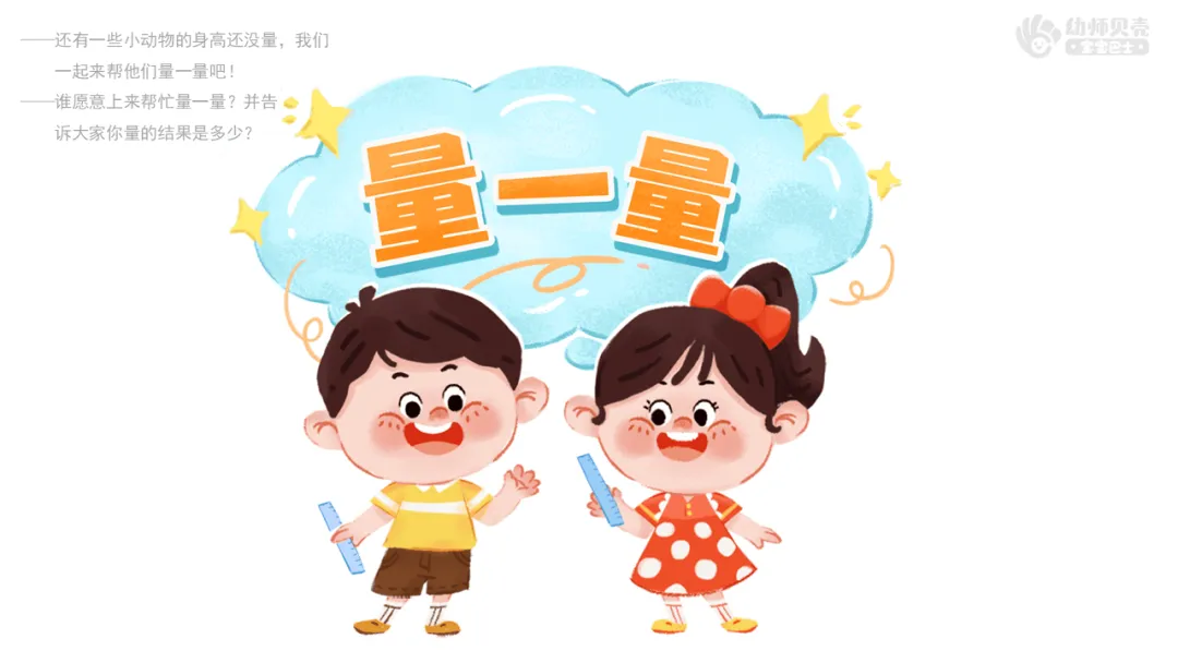 ——还有一些小动物的身高还没量,我们一起来帮他们量一量吧! ——谁愿意上来帮忙量一量?并告诉大家你量的结果是多少? ——这个测量方式和结果正确吗?哪里出了问题?