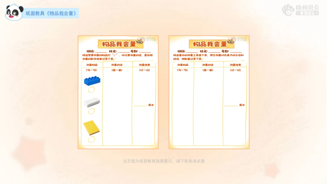 2.发放纸面教具《物品我会量》,幼儿自主选择测量物品并记录结果。
