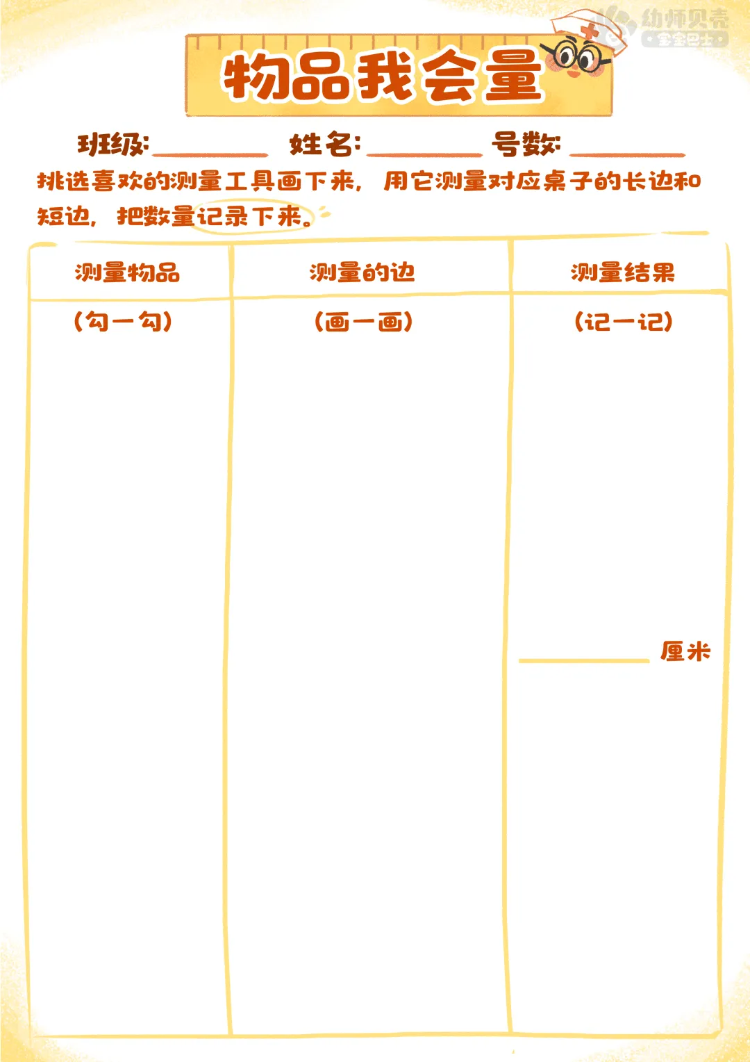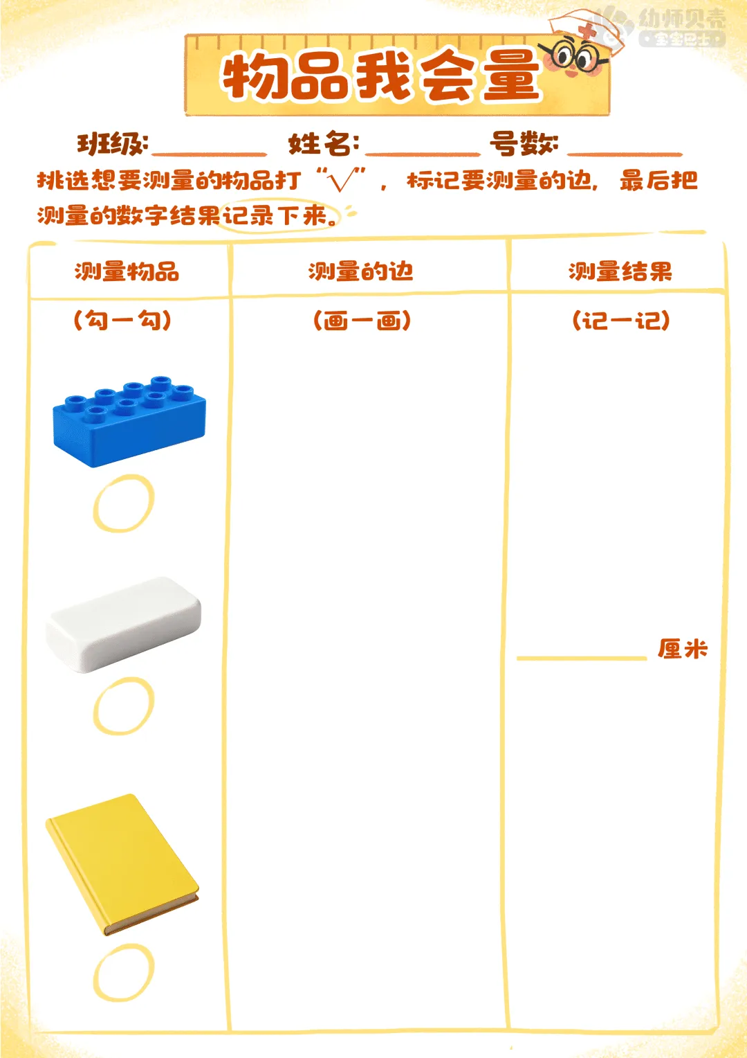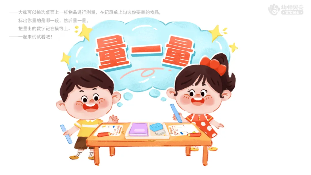 ——大家可以挑选桌面上一样物品进行测量,在记录单上勾选你要量的物品,标出你量的是哪一段,然后量一量,把量出的数字记在横线上。
