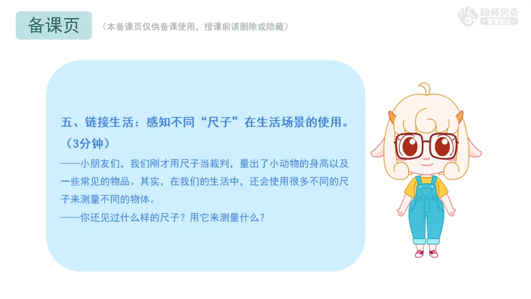 五、链接生活:感知不同“尺子”在生活场景的使用。(3分钟)——小朋友们,我们刚才用尺子当裁判,量出了小动物的身高以及一些常见的物品。其实,在我们的生活中,还会使用很多不同的尺子来测量不同的物体。