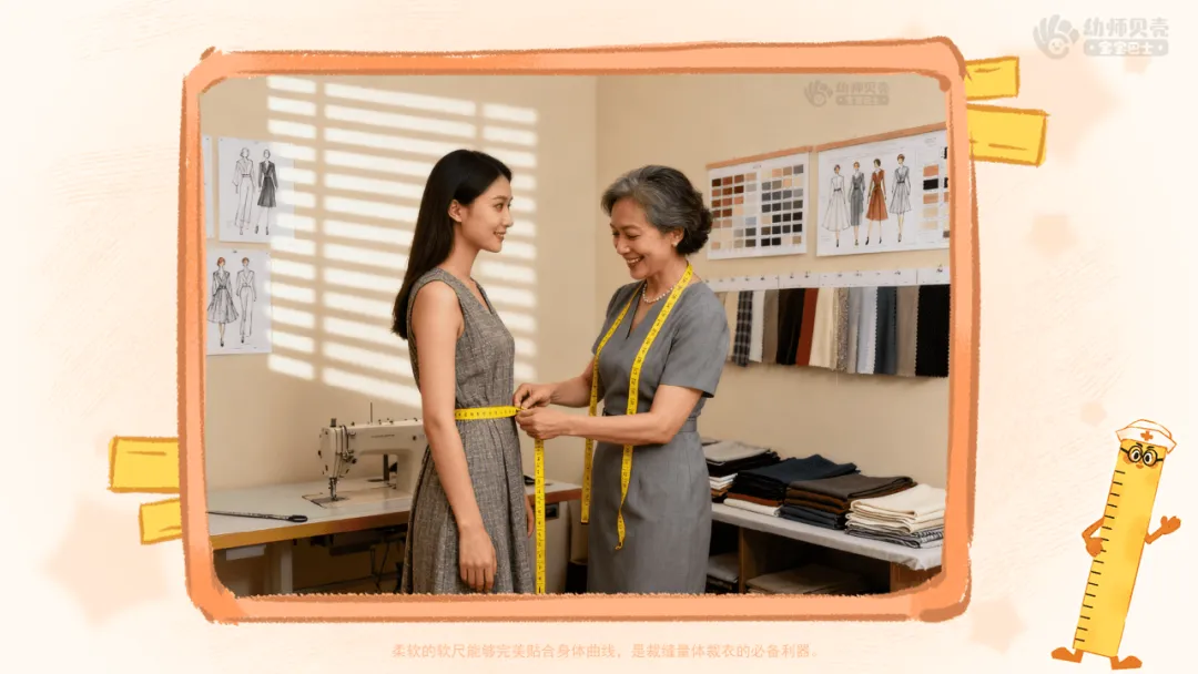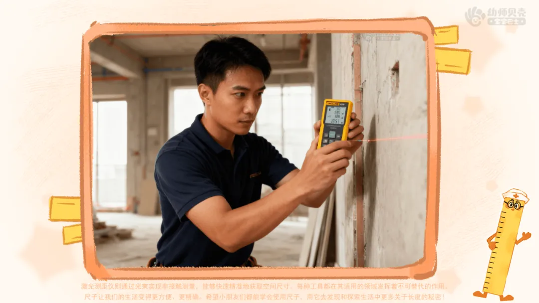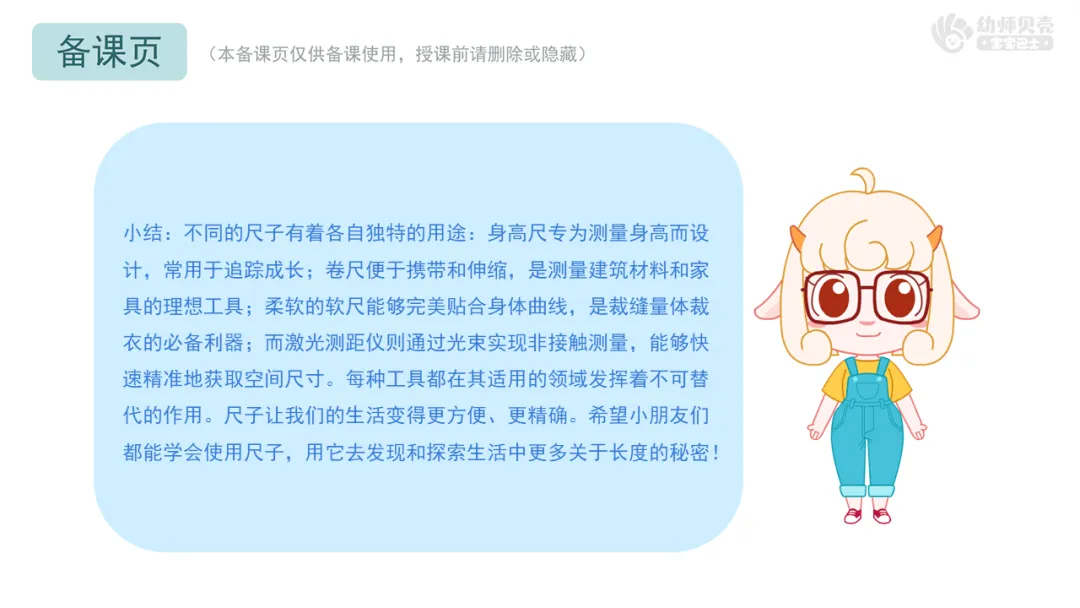 小结:不同的尺子有着各自独特的用途:身高尺专为测量身高而设计,常用于追踪成长;卷尺便于携带和伸缩,是测量建筑材料和家具的理想工具;柔软的软尺能够完美贴合身体曲线,是裁缝量体裁衣的必备利器;而激光测距仪则通过光束实现非接触测量,能够快速精准地获取空间尺寸。每种工具都在其适用的领域发挥着不可替代的作用。尺子让我们的生活变得更方便、更精确。希望小朋友们都能学会使用尺子,用它去发现和探索生活中更多关于长度的秘密!