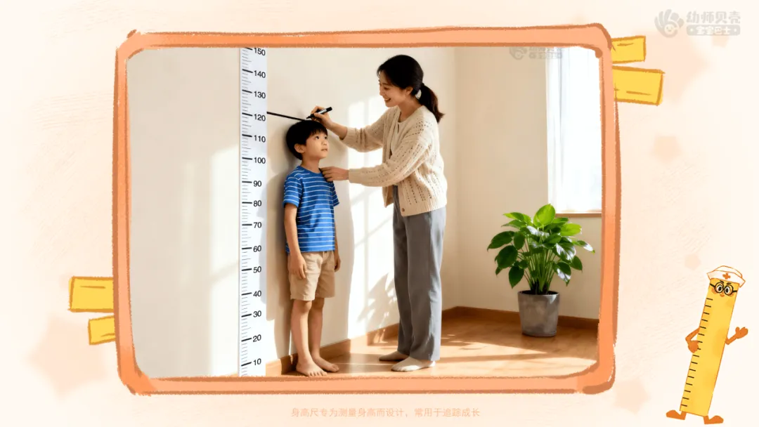 在班级墙面设置一块“我们的成长”身高墙,定期(如每季度)鼓励幼儿两两合作,互相测量身高并记录,直观感受自己的成长变化。