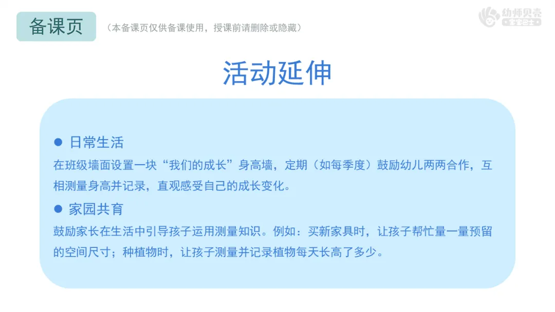 鼓励家长在生活中引导孩子运用测量知识。例如:买新家具时,让孩子帮忙量一量预留的空间尺寸;种植物时,让孩子测量并记录植物每天长高了多少。