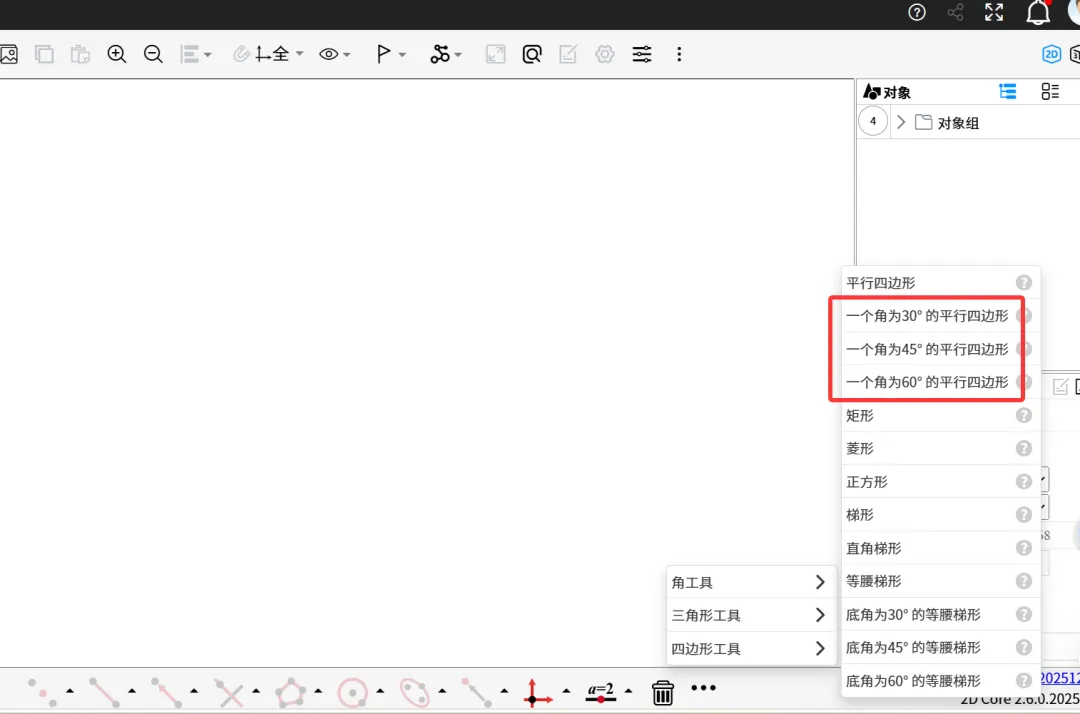2.点击“...”-四边形工具-一个角为60°的平行四边形,生成之后可以拖动端点调整大小,或者全部选中拖动位置。