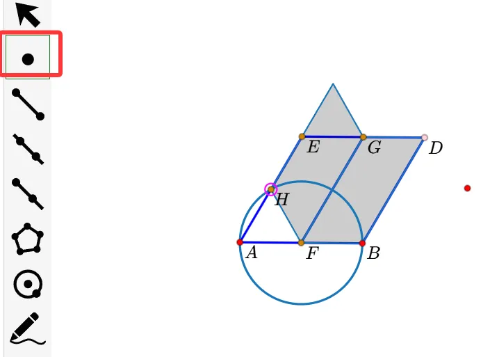8.点击圆工具-依次点击“F”、“B”-生成一个圆;点击点工具-生成点“H”。