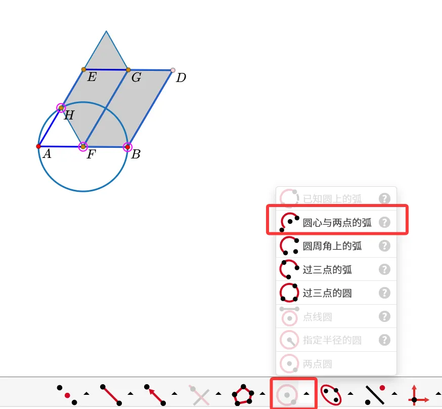 9.依次点击“F、B、H”,点击“圆心与两点的弧”,