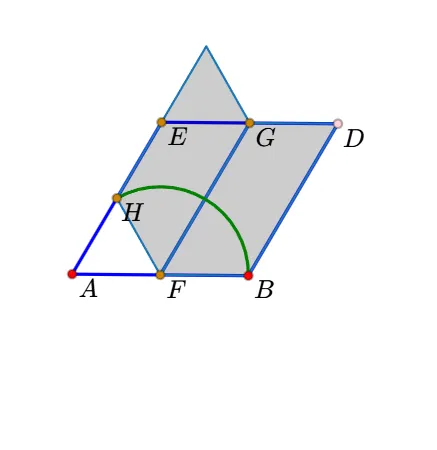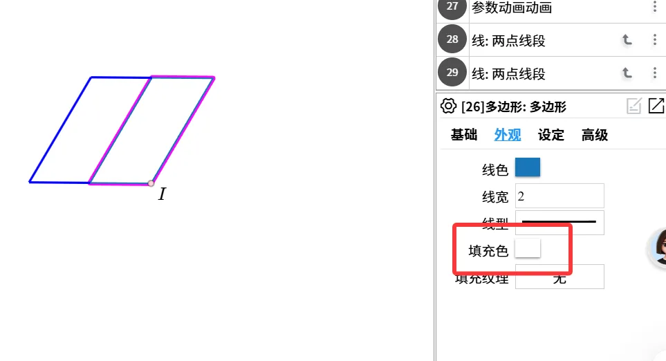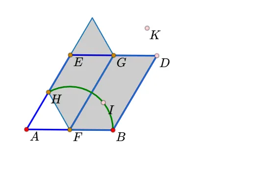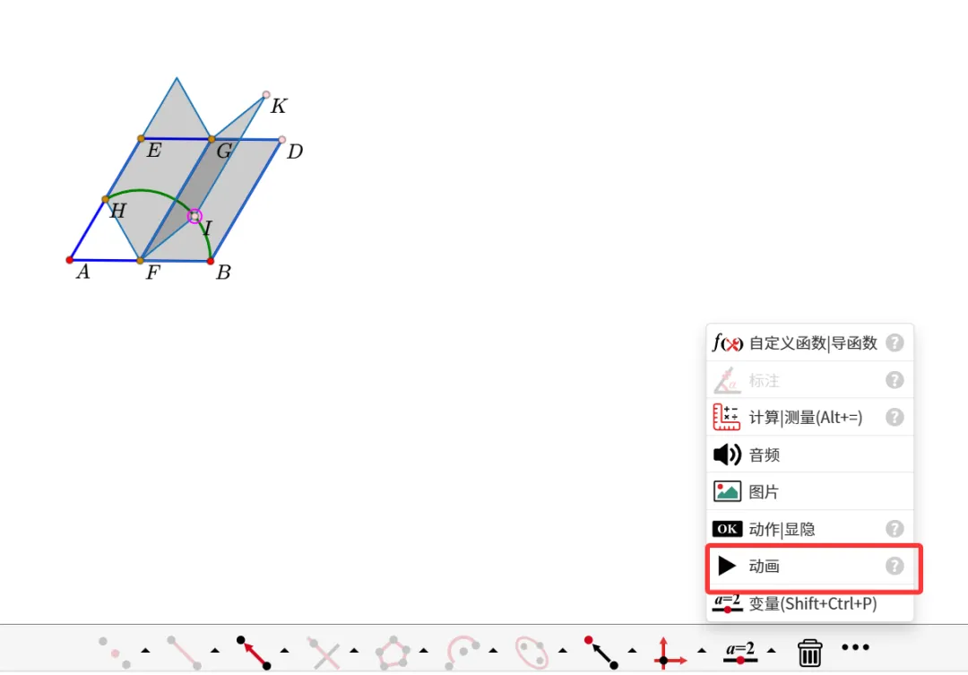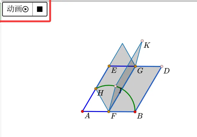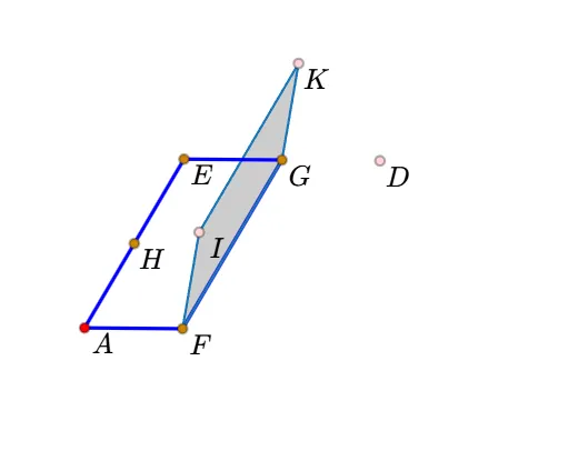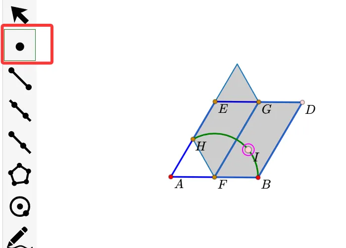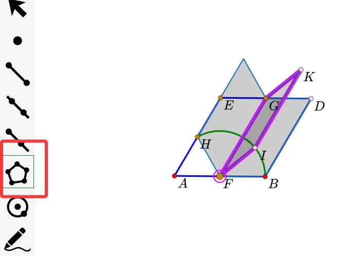 13.利用左侧栏的多边形工具,依次点击“I、K、G、F、I”,生成平行四边形。(更正:使用线段工具-依次点击FI、IK、GK、GF。不要使用多边形工具了,否则后面不能单独改变GF的线型。)