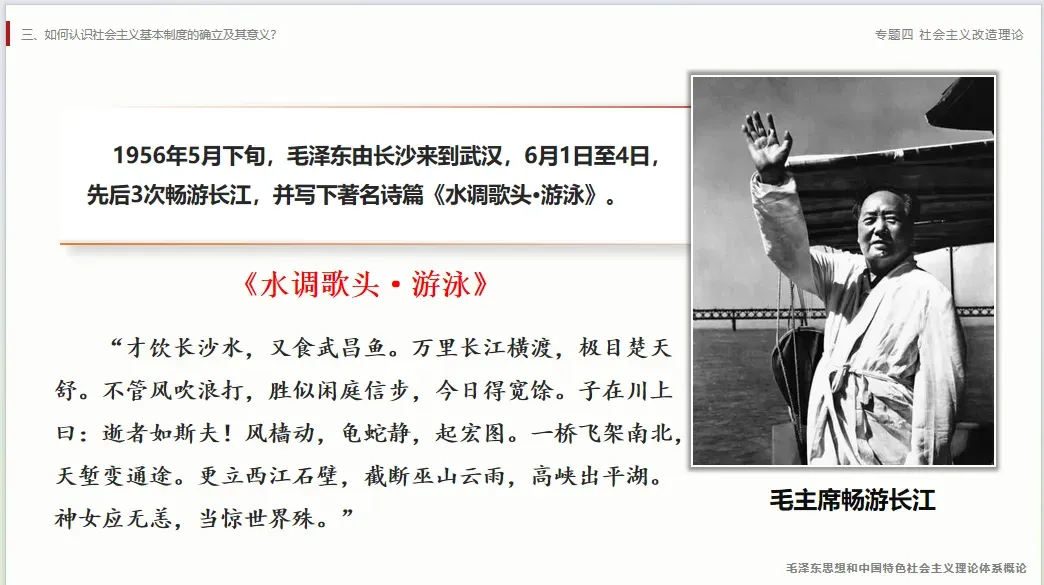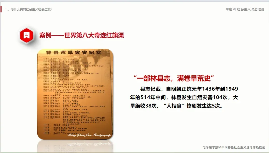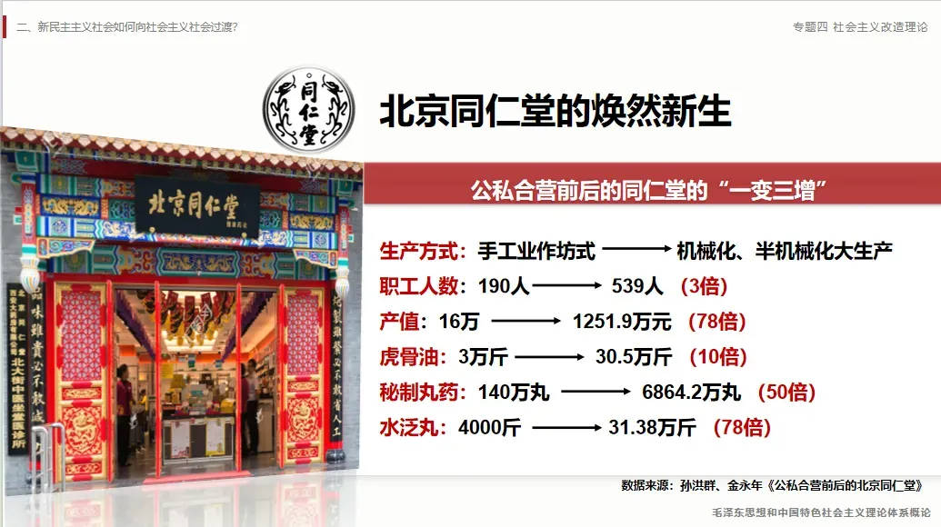 逻辑思路:将案例按照 “改造原因 —改造过程—改造意义”的逻辑框架进行重新分配和组织,这部分案例旨在说明,改造不是凭空而来的政策,而是当时国内外严峻形势和内在矛盾发展的必然结果。案例:毛主席的“能造什么”之问 & 156项重点工程用途说明国家工业化(一化)的极端紧迫性。旧中国工业基础薄弱,连一辆汽车、一架飞机都不能造,无法保障国家安全和民生福祉。因此,集中力量实现工业化,是生存和发展的唯一选择。156项工程的引进,正是为实现工业化奠定物质基础,而工业化要求生产关系与之相适应。说明严峻的国际环境与国家安全压力。新生政权面临直接的军事威胁(朝鲜战争)和冷战格局下的政治孤立、经济封锁。这种“落后就要挨打”的危机感,迫使中国必须快速建立一个能够凝聚全国资源、支撑强大国防的社会主义经济体系。案例:土地改革后的农村新问题 & 红旗渠的旧日苦难用途说明农村个体经济的局限性与内在矛盾。土改后,农民虽然获得了土地,但分散、落后的个体经济无法抵御天灾人祸(如红旗渠地区缺水的惨剧),且容易出现新的贫富分化。这证明了将农民组织起来,走集体化道路,以解放和发展农村生产力的必要性。作为反面参照,增强论证的紧迫感。西方学者认为中国经济恢复困难,共产党政权可能“昙花一现”。这从侧面印证,如果新中国不进行深刻的社会革命和制度变革,就无法打破旧有枷锁,实现真正的独立和富强。小结逻辑:这些案例共同描绘了一幅图景:一个一穷二白、内外交困的新中国,为了生存(国家安全)、富强(国家工业化)和公平(避免两极分化),必须对旧的生产关系进行彻底的社会主义改造。二、 改造过程:如何实现有中国特色的社会主义改造?这部分案例旨在展示中国共产党如何创造性地将马克思主义原理与中国实际相结合,走出一条和平、渐进、富有智慧的改造之路。农业改造案例:“穷棒子社”(王国藩)与劳模吕玉兰用途生动诠释农业改造的 “自愿互利、典型示范、国家帮助” 原则和 “循序渐进” 的步骤。它不是强迫命令,而是通过“穷棒子”们自力更生、合作增产的真实榜样,吸引广大农民自愿加入从互助组到合作社的集体化道路。展现了农民中蕴藏的社会主义积极性。说明手工业改造不是消灭传统和特色,而是通过合作化实现生产组织的升级与技艺的传承发展。毛主席特别指示“一万年也不要搞掉”,体现了政策中对民族文化瑰宝的保护意识。案例展示了从手工作坊到专业生产合作社的转变过程。这是和平赎买与阶级政策的典范。荣毅仁作为“红色资本家”的代表,其“首先是一个中国人”的告白,深刻体现了党对民族资产阶级“既团结又改造”政策的成功,以及资产阶级自身在历史大势下的理性选择。同仁堂的合营与发展用具体数据展示公私合营如何解放生产力。合营后,同仁堂在规模、产能、技术、员工福利等方面实现了跨越式发展,证明了国家资本主义形式对国计民生的积极作用,让资本家看到接受改造的光明前景。“东来顺涮羊肉”与“全聚德烤鸭”的质量风波辩证地展示改造中的问题与纠偏。这两个案例坦率地指出了在改造高潮中,因工作过粗、管理简单化而一度导致老字号品质下降的问题,以及陈云同志等领导人如何调查研究、尊重经济规律、及时纠正偏差。这使教学更具客观性和深度。小结逻辑:改造过程不是一刀切,而是分领域、讲政策、有步骤的。农业靠引导示范,手工业重组织传承,对资本主义工商业则实现了史无前例的 “和平赎买” 。整个过程虽有探索中的曲折(如速度过快、工作过粗),但主线是创造性的、成功的。三、 改造意义:社会主义基本制度确立带来了什么?这部分案例旨在具象化改造的伟大成果,并升华其历史地位。案例:1952年与1956年国民经济结构对比图用途最直观的数据证明。通过两张图表中公有制经济(国营、合作社、公私合营)占比从21.3%飙升到92.9%,而私有制经济急剧萎缩的鲜明对比,量化展示了社会主义经济基础如何根本性地确立起来。案例:第一部《中华人民共和国宪法》与人民代表大会制度用途说明改造不仅是经济革命,也推动了上层建筑——社会主义政治制度的完善。宪法的颁布和人大制度的确立,从根本法层面巩固了改造的成果,保障了人民当家作主的权利,标志着社会主义政治制度体系的基本形成。展现领导人的信心与人民的昂扬斗志。毛主席在改造基本完成时的喜悦心情,以及“一桥飞架南北,天堑变通途”的诗词,象征着摆脱了旧制度束缚的中国,正充满豪情地开始全面建设社会主义的新征程。这与《社会主义好》的歌声一样,反映了当时的社会氛围。案例:《中共中央关于党的百年奋斗重大成就和历史经验的决议》评价用途立足当下,定调历史。用党的最新重大历史决议中的权威表述——“最为广泛而深刻的社会变革”、“伟大飞跃”——来为社会主义改造的意义进行定性和定位,将其纳入中华民族伟大复兴的连续历史进程中,凸显其不可替代的里程碑意义。小结逻辑:社会主义改造的意义是全方位、深层次的:它奠定了我国的社会主义经济基础,完善了社会主义政治制度,改变了人民的阶级地位与精神面貌,不仅是中国历史上的伟大飞跃,也是世界社会主义运动史上的成功典范。依循“原因→过程→意义”的线性叙事,在每一