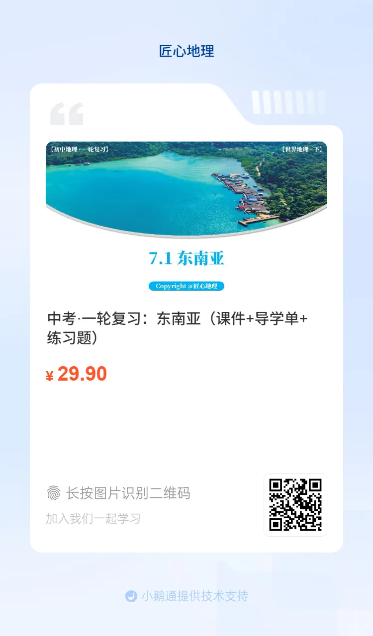 方式①:描下方二维码,获取新教材中考地理·一轮复习资料,含课件+导学单+练习题+送七八年级知识填图。(之前买过成套课件者,系统匹配优惠券,立减50)