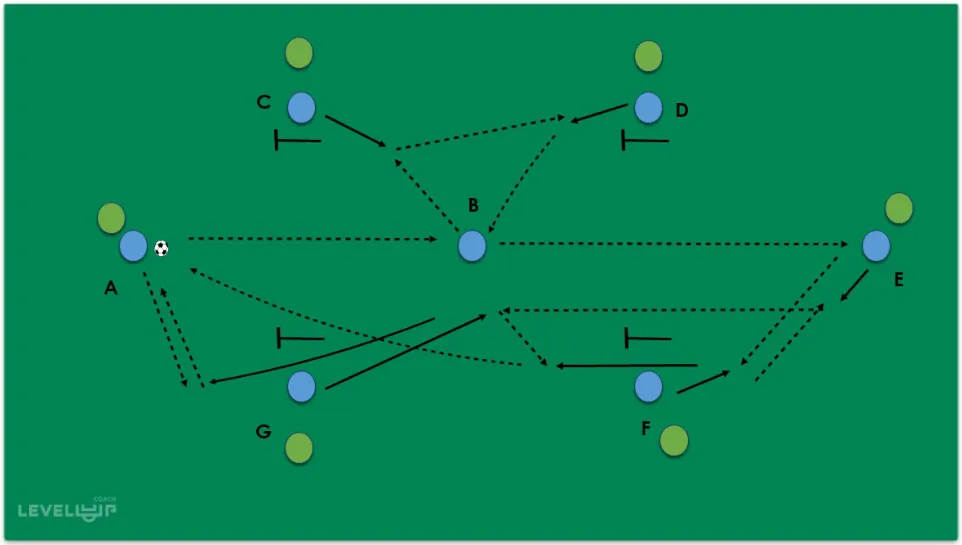 这个练习的精髓在于"第三个人"概念——球在A脚下时,球员已经在思考:C接应、B前插、G创造线路。传球不是等出来的,是预判出来的。11步循环让每个球员都要扮演"持球者→墙式配合者→第三个人"三种角色,真正理解进攻的节奏感。
