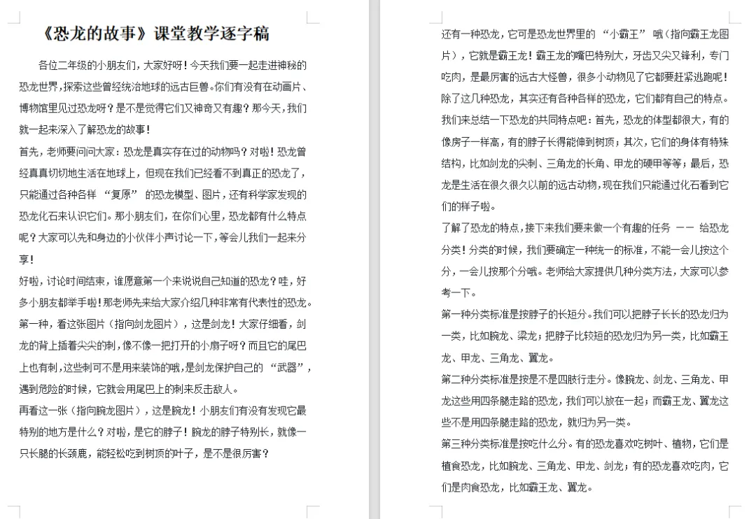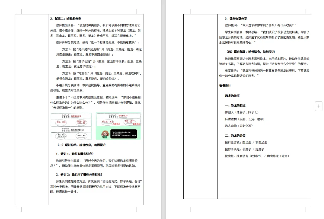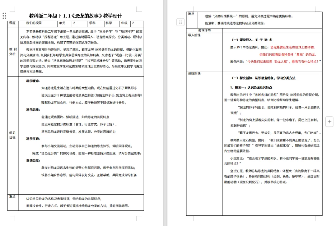 【科学教案课件】新教材教科版版小学科学二年级下册全册表格配套教案(含逐字稿+详细反思)第1课《恐龙的故事》