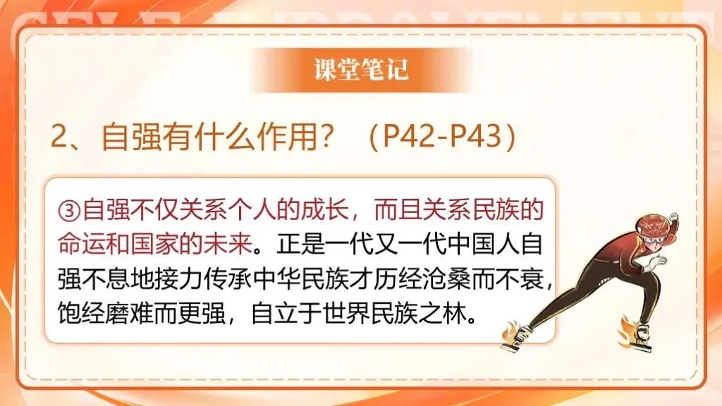 政治认同:理解自强的含义,认识到自强不仅关乎个人命运,还与民族、国家命运相连,树立正确的民族观、国家观。