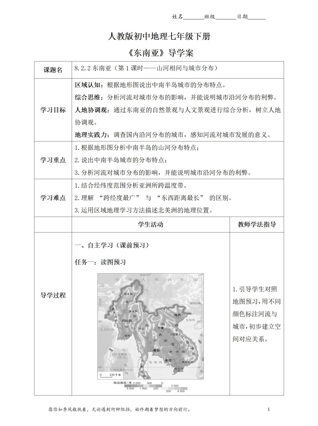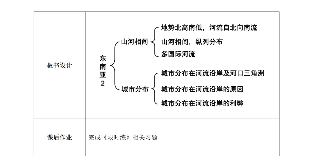 通过读图填表活动,明确河内、金边、曼谷等大城市集中分布在大河沿岸及河口三角洲的规律;梳理城市与河流的对应关系,让分布特点具象化,便于学生理解记忆。