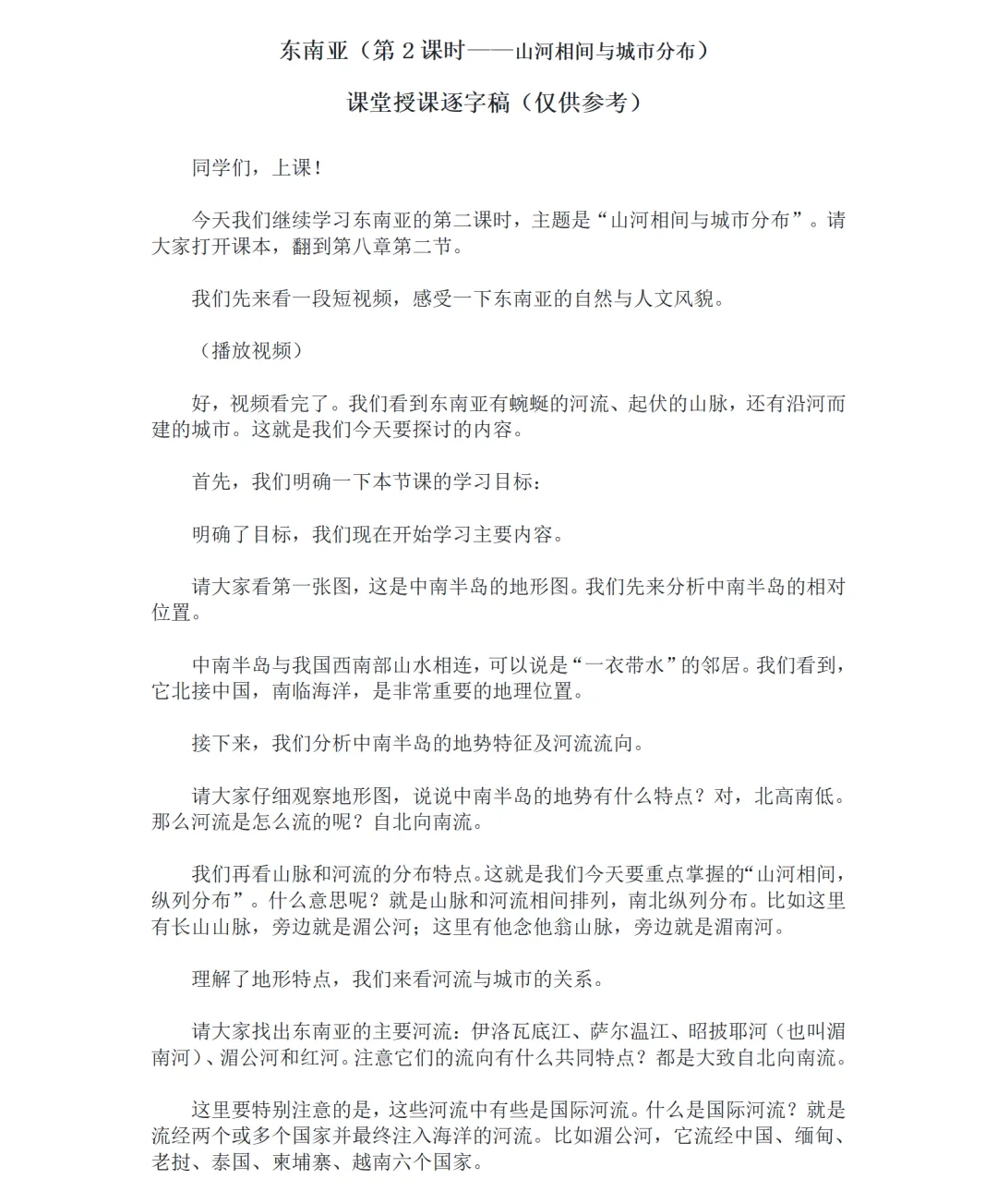 依托地形图梳理中南半岛核心特征:与我国西南部山水相连,地势北高南低,河流自北向南流,形成 “山河相间、纵列分布” 的格局;明确伊洛瓦底江、湄公河等主要河流,点出湄公河等国际河流的特点,夯实自然地理基础。