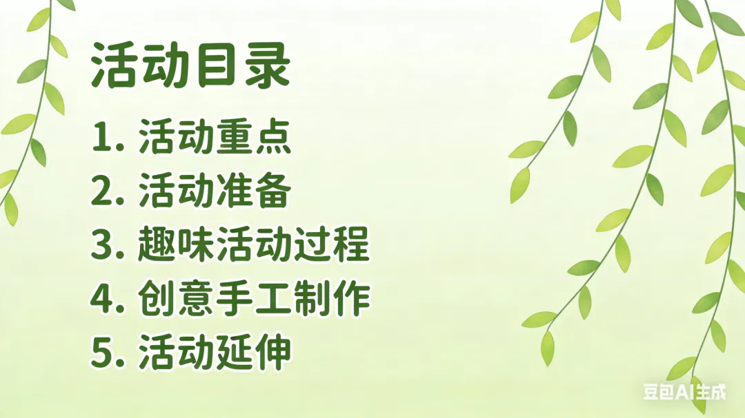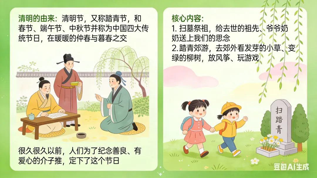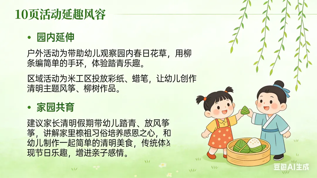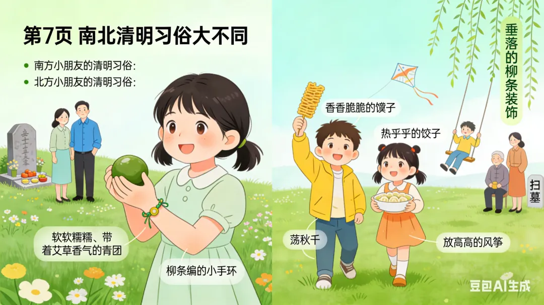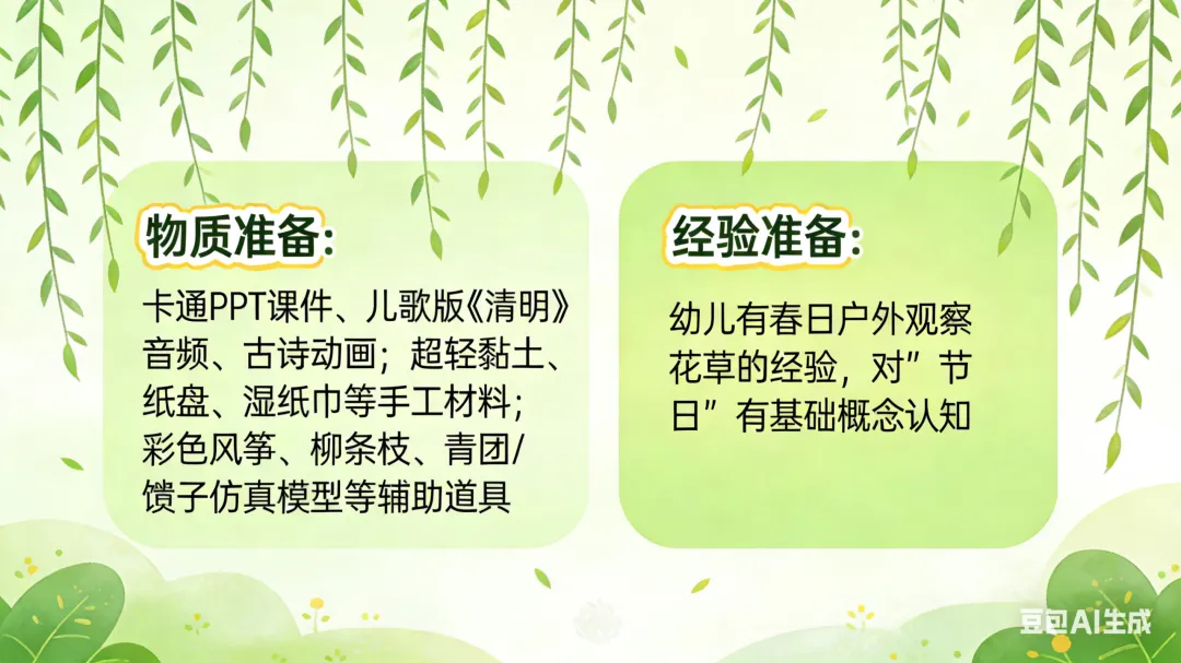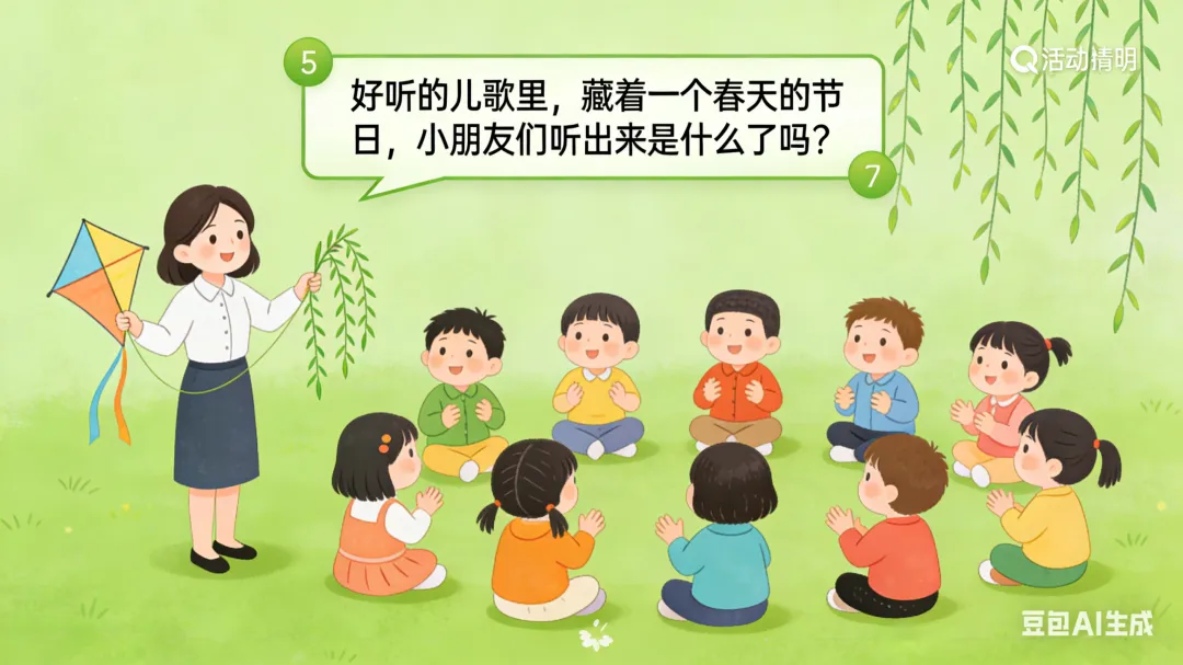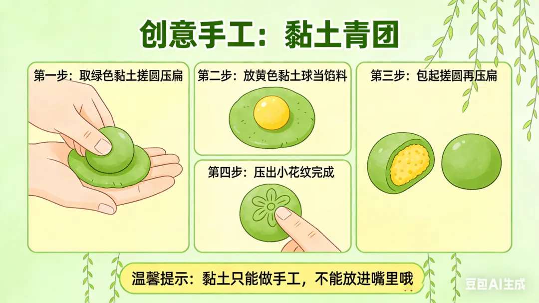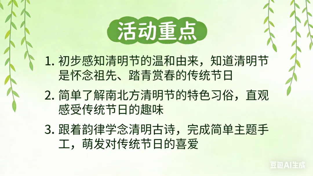 一、活动重点 1. 初步感知清明节的温和由来,知道清明节是怀念祖先、踏青赏春的传统节日,建立对节日的基础认知。2. 简单了解南北方清明节的特色习俗,通过直观的图片、实物感知传统节日的趣味。3. 能跟着韵律念诵清明古诗,完成简单的清明主题手工,锻炼手部精细动作,萌发对传统节日的喜爱。 二、活动准备 (一)物质准备 1. 卡通PPT课件:简化版清明由来动画、南北方清明习俗对比图、青团/馓子/风筝/柳树等节日元素图片、《清明》古诗动画。2. 音频材料:儿歌版《清明》音频、轻柔的春日背景音乐。3. 手工材料:每人一份超轻黏土(绿色、黄色为主)、一次性纸盘(放作品用)、湿纸巾。4. 辅助道具:彩色风筝、柳条枝、青团与馓子的仿真模型(或实物)。 (二)经验准备 幼儿有过春日户外散步、观察花草树木的经验,对“节日”有初步的概念认知。 三、活动过程(总时长20分钟,适配小班幼儿注意力特点) (一)趣味导入:儿歌激趣,引出主题(3分钟) 1. 教师播放儿歌版《清明》音频,带领幼儿跟着音乐拍手、做简单的晃身体动作,快速活跃课堂氛围。2. 互动提问,唤醒感知:“小朋友们,刚刚好听的儿歌里,藏着一个春天的节日,谁听出来它叫什么名字啦?”3. 出示彩色风筝、柳条枝道具,引导幼儿观察说出“春天”“风筝”“柳树”,顺势引出:“对啦,这个节日就是清明节,它在暖暖的春天里,是一个很特别的传统节日,今天我们就一起来认识它吧!” (二)感知由来:简化故事,温和讲解(4分钟) 1. 教师播放简化版清明由来卡通动画,用温柔、易懂的幼儿化语言讲述故事,规避复杂、恐怖的历史细节,只传递核心情感:“很久很久以前,有一位叫介子推的人,他特别善良、特别有爱心,帮助了很多很多人,大家都很喜欢他、尊敬他。后来他离开了大家,人们都特别想念他,就把每年春天的这一天,定为了清明节。在清明节这一天,大家会给去世的爷爷奶奶、祖先们送上好吃的,告诉他们我们很想念他们;同时呀,春天到了,小草发芽了,柳树变绿了,小花也开了,大家还会去郊外走一走,看看美丽的春天,放风筝、玩游戏,可开心啦。”2. 简单提问巩固,强化核心认知:“小朋友们,听完故事,谁能告诉老师,清明节我们会做哪两件事呀?”引导幼儿说出“想念祖先”“去看春天、放风筝”即可,不做过高要求。 (三)认识习俗:南北对比,直观感知(4分钟) 1. 教师出示南北方习俗对比PPT,配合仿真模型,用幼儿能听懂的语言,分别介绍南方、北方的清明特色习俗,重点突出孩子最感兴趣的“美食”和“游戏”: 南方小朋友的清明习俗:清明节的时候,南方的小朋友会吃绿绿的、软软的青团。青团是用艾草的叶子和糯米做的,里面有甜甜的豆沙、咸香的蛋黄,一口下去软软糯糯的。他们还会和爸爸妈妈去郊外踏青,用柳条编好看的手环,去扫墓怀念祖先。 北方小朋友的清明习俗:北方的小朋友,清明节会吃脆脆的馓子,还有热乎乎的饺子。他们也会和爸爸妈妈一起去扫墓,还会去荡秋千、放风筝,大家说,风筝飞得越高越远,就能把不开心的事情都放走,迎来开开心心的春天。 2. 互动体验环节:给幼儿传阅青团、馓子的模型,让幼儿看一看、摸一摸,提问“小朋友们,你们吃过这两种好吃的吗?”“清明节的时候,你和爸爸妈妈会做什么呀?”,调动幼儿的生活经验,加深对习俗的印象。 (四)古诗学念:动作配合,轻松记忆(3分钟) 1. 教师播放《清明》古诗动画,带领幼儿安静观看,感受古诗的韵律和春日的氛围。2. 教师用慢速、温柔的语气念古诗,配合简单的肢体动作,降低学习难度,带领幼儿一起学念,重复2-3遍即可,不要求完全背诵,重点感受韵律:《清明》唐·杜牧清明时节雨纷纷(双手做小雨落下的动作,轻轻晃动手指)路上行人欲断魂(双手放在身体两侧,做慢慢走路的动作)借问酒家何处有(双手放在嘴巴旁边,做喊话的动作)牧童遥指杏花村(一只手举起来,伸出手指,指向远方的动作) (五)手工创作:黏土青团,动手体验(5分钟) 1. 教师出示提前做好的黏土青团作品,激发幼儿兴趣:“刚刚我们认识了南方小朋友清明节爱吃的青团,今天我们就用自己的小手,做一个专属的可爱青团吧!”2. 教师分步示范,语言简单直白,适配小班幼儿动手能力:① 先拿一块绿色的黏土,放在手心,两只手配合搓成圆圆的球;② 把圆球轻轻压扁,做成一个圆圆的小饼;③ 拿一点点黄色的黏土,搓成小小的球,放在绿色小饼中间,当甜甜的馅料;④ 把绿色小饼慢慢包起来,再搓成圆圆的球,轻轻压扁,一个青团就做好啦;⑤ 还可以用小手指在青团上,轻轻压出好看的小花纹哦。3. 幼儿动手创作,教师巡回指导,重点提醒幼儿“不能把黏土放进嘴里”,主动帮助动手能力弱的幼儿,鼓励幼儿大胆创作。4. 作品展示:将幼儿做好的青团放在纸盘上,集体展示,表扬每一位认真创作的小朋友,让幼儿感受动手的快乐和成功的喜悦。 (六)活动结束:总结回顾,温馨收尾(1分钟) 教师总结:“今天我们一起认识了清明节,知道了清明节要怀念祖先,要去看美丽的春天,还认识了南方和北方不一样的清明习俗,学会了清明的古诗,还自己做了可爱的青团,小朋友们都太棒啦!之后我们可以和爸爸妈妈一起,去郊外踏青、放风筝,好好感受暖暖的春天哦。” 四、活动延伸 1. 园内延伸:户外活动时,带领幼儿去种植园观察春天的花草树木,用柳条编简单的手环,体验踏青的乐趣;美工区投放彩纸、蜡笔,让幼儿继