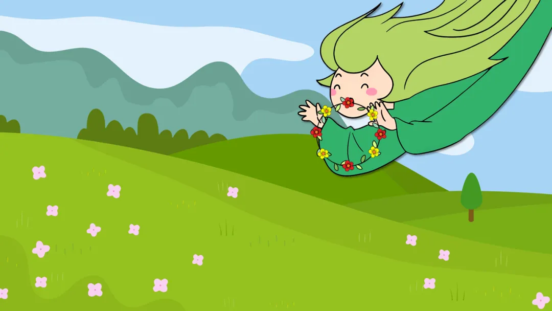 的场景及欢快的音乐,边唱边跳进入)花园里有好多花啊!春天真