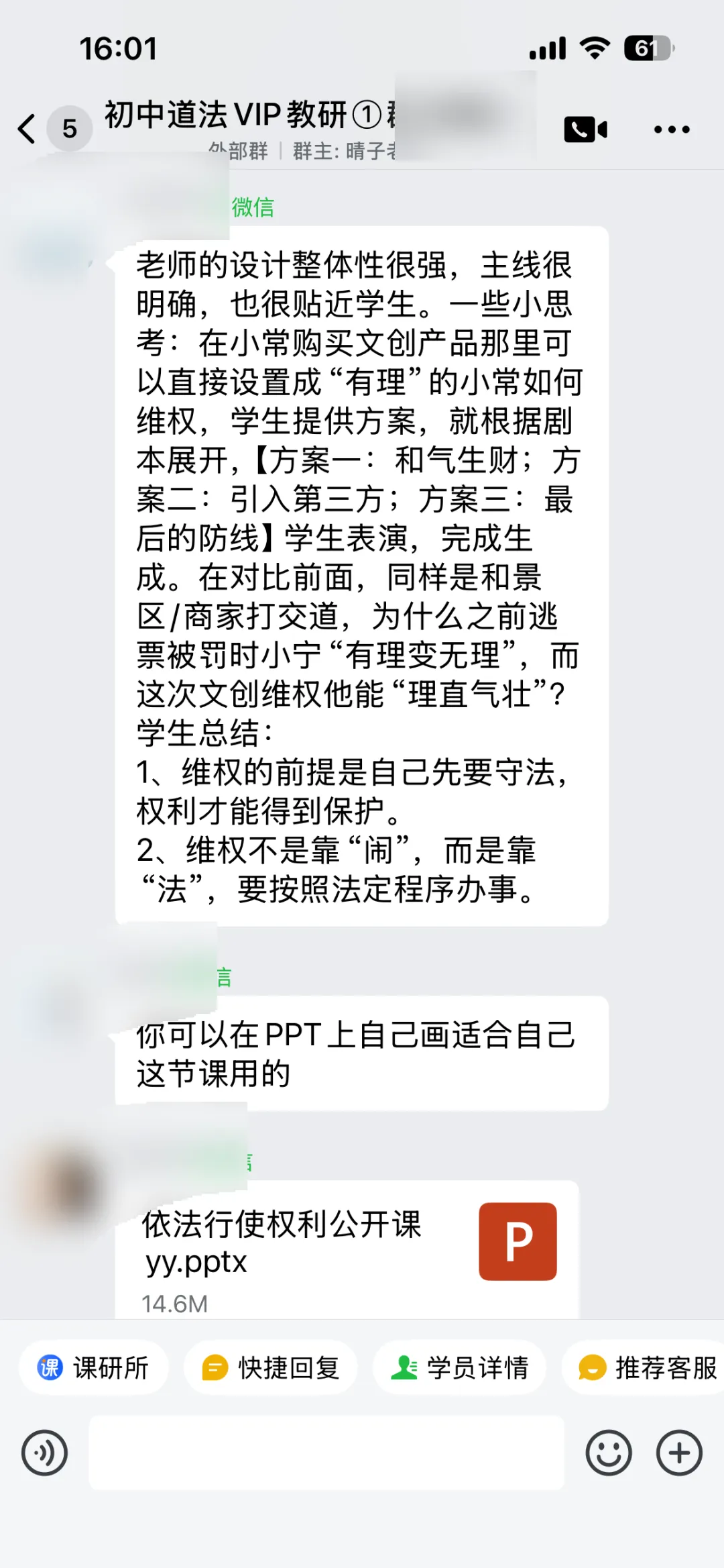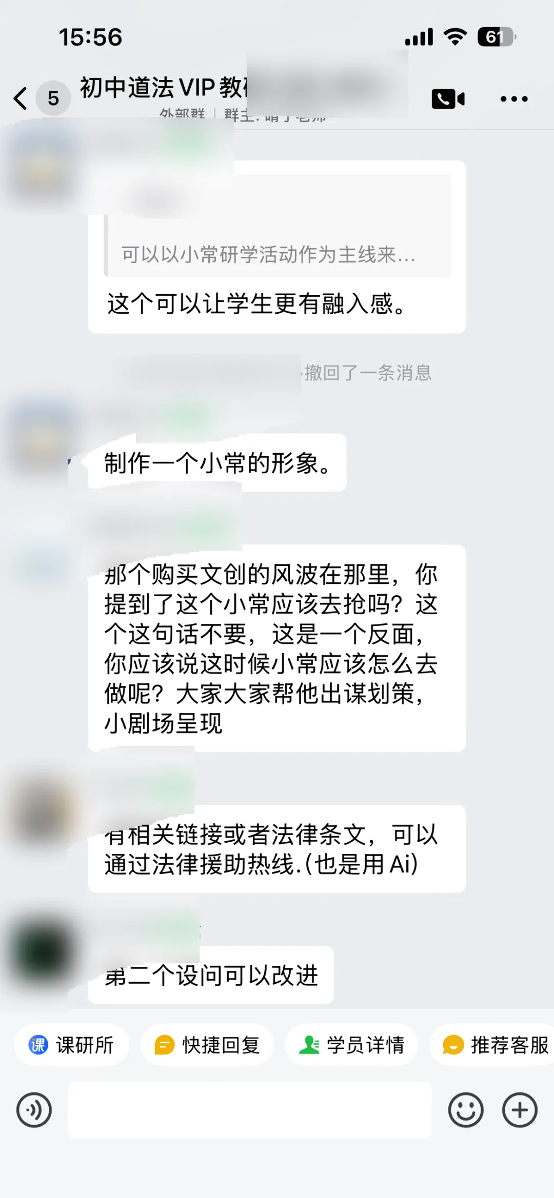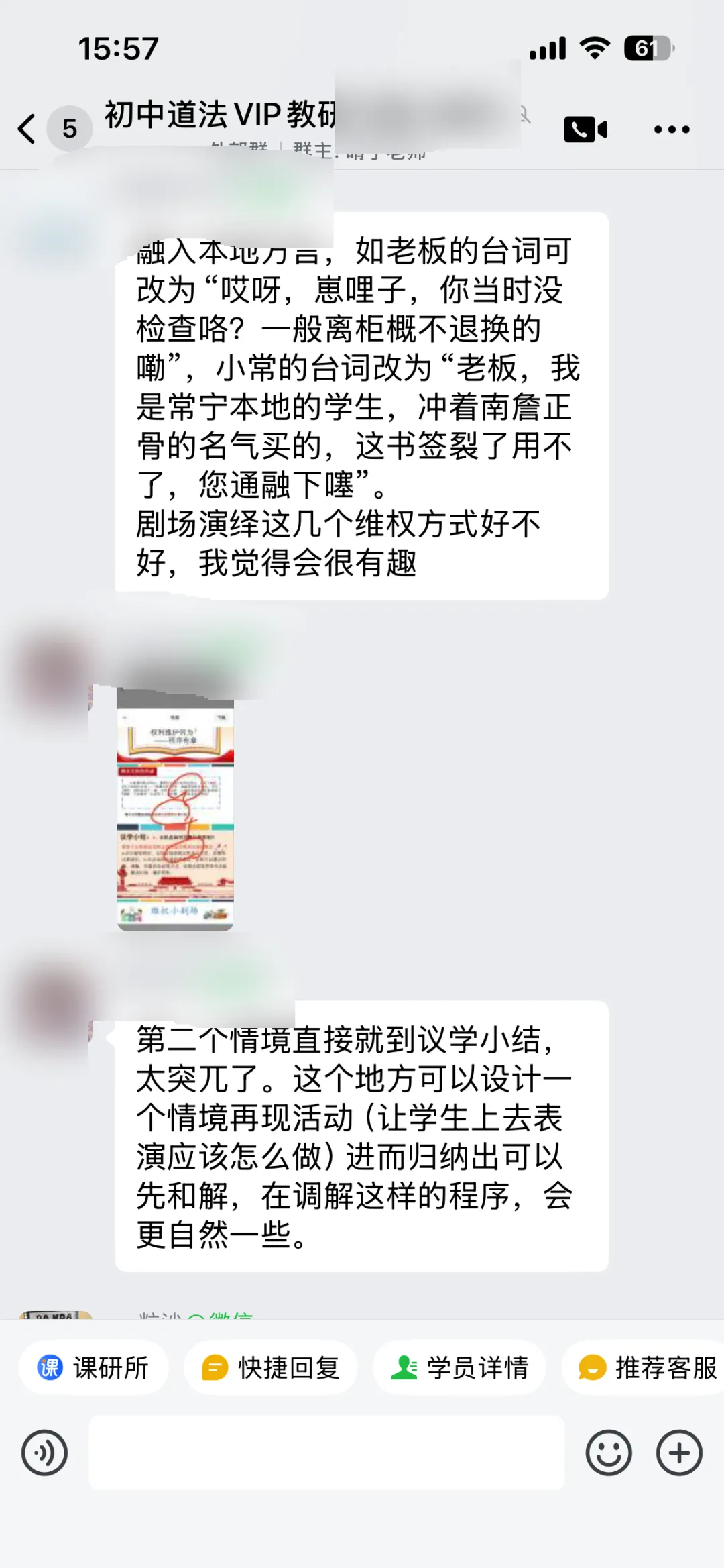 老师在情境设计和设问、环节衔接方面有些疑问,教研群展开了非常热烈的讨论,给老师提供了超级多有用且可实行的点子,比如完善了剧情导入、连线AI律师、修改设问、在小剧场表演中加入方言等等。