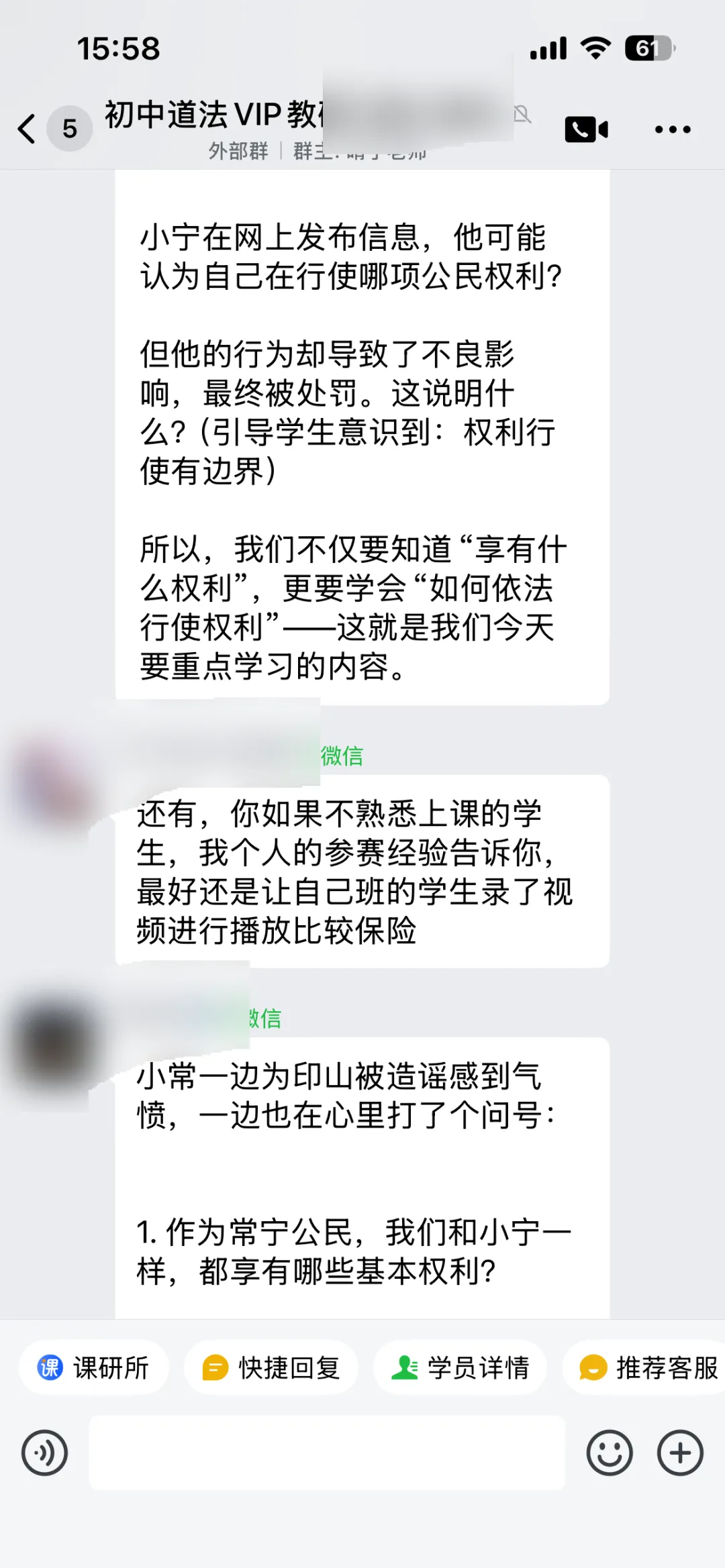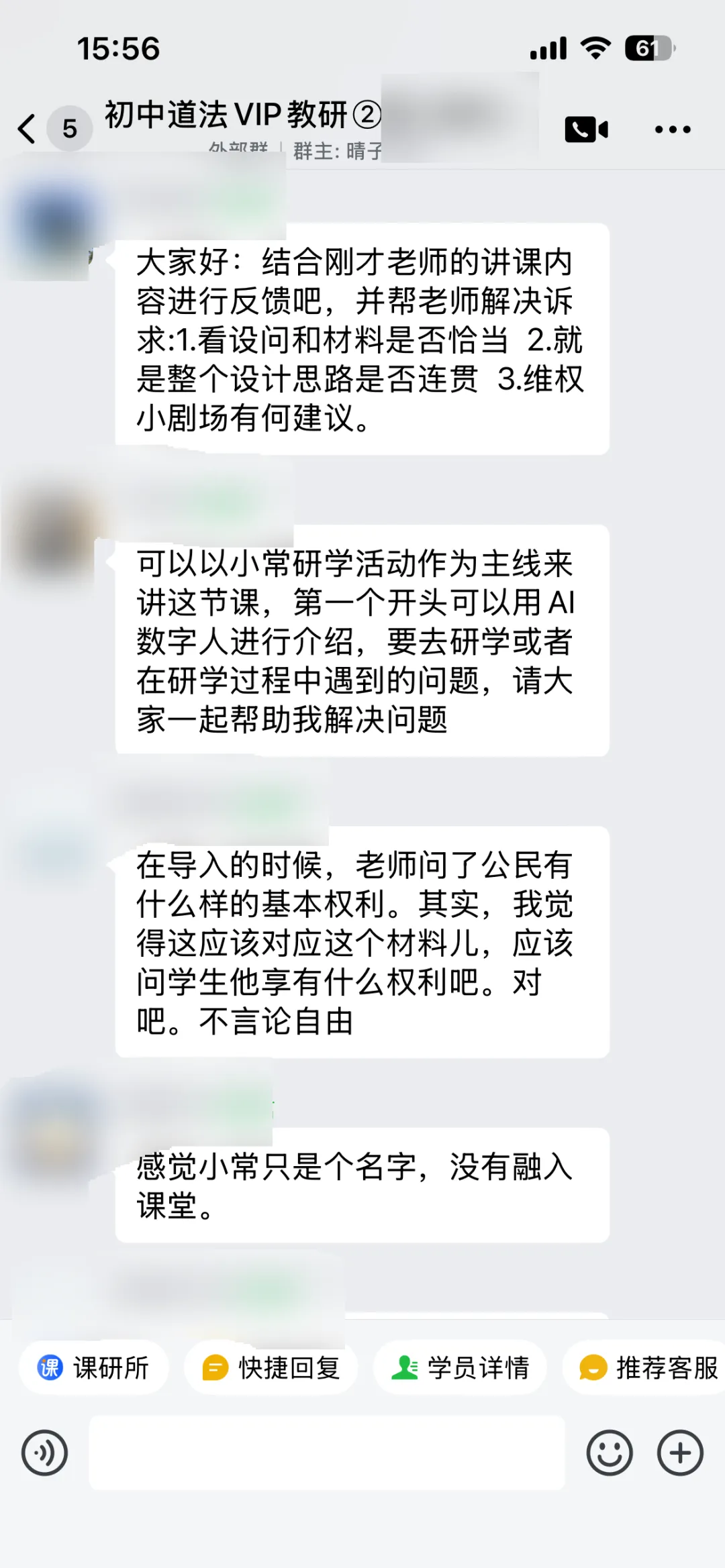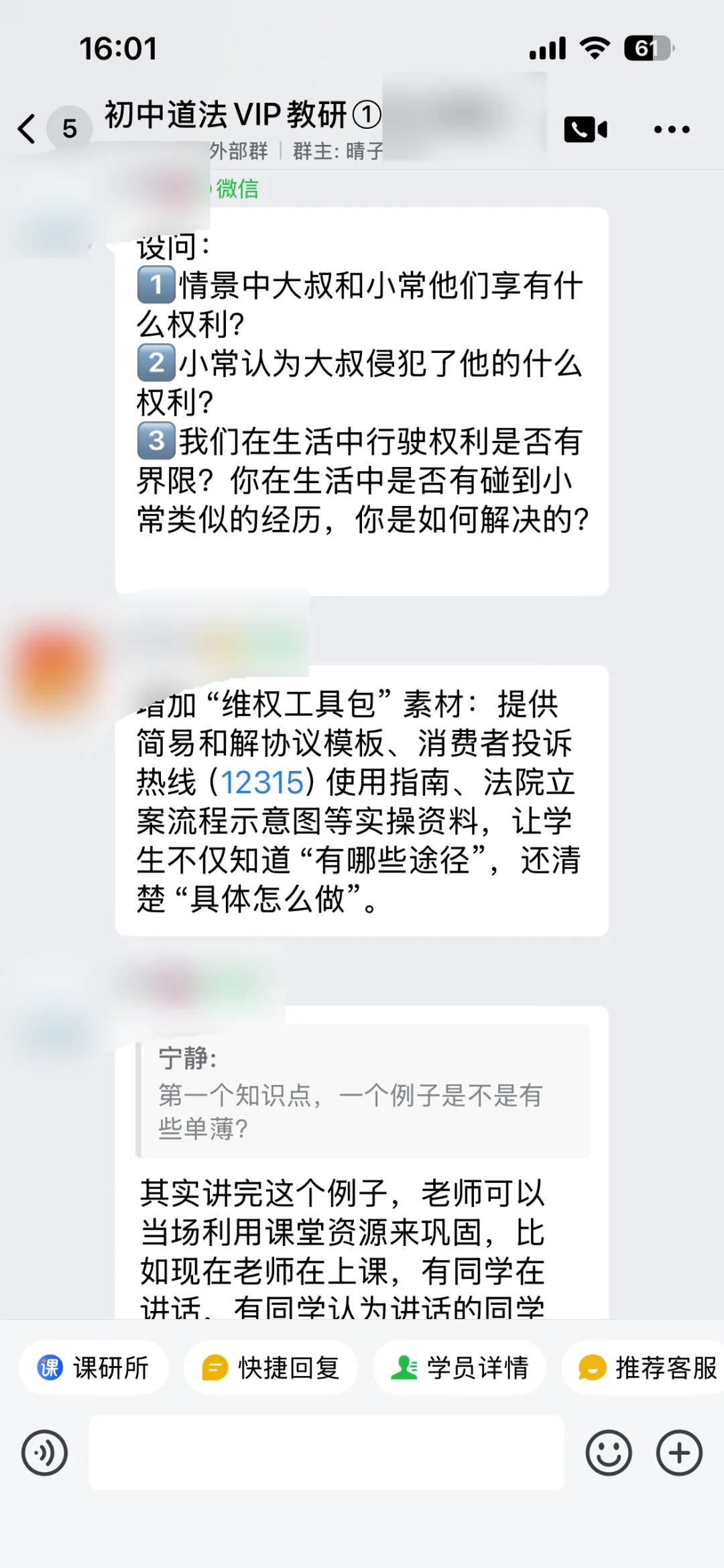 老师在情境设计和设问、环节衔接方面有些疑问,教研群展开了非常热烈的讨论,给老师提供了超级多有用且可实行的点子,比如完善了剧情导入、连线AI律师、修改设问、在小剧场表演中加入方言等等。